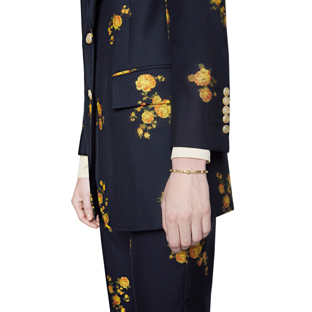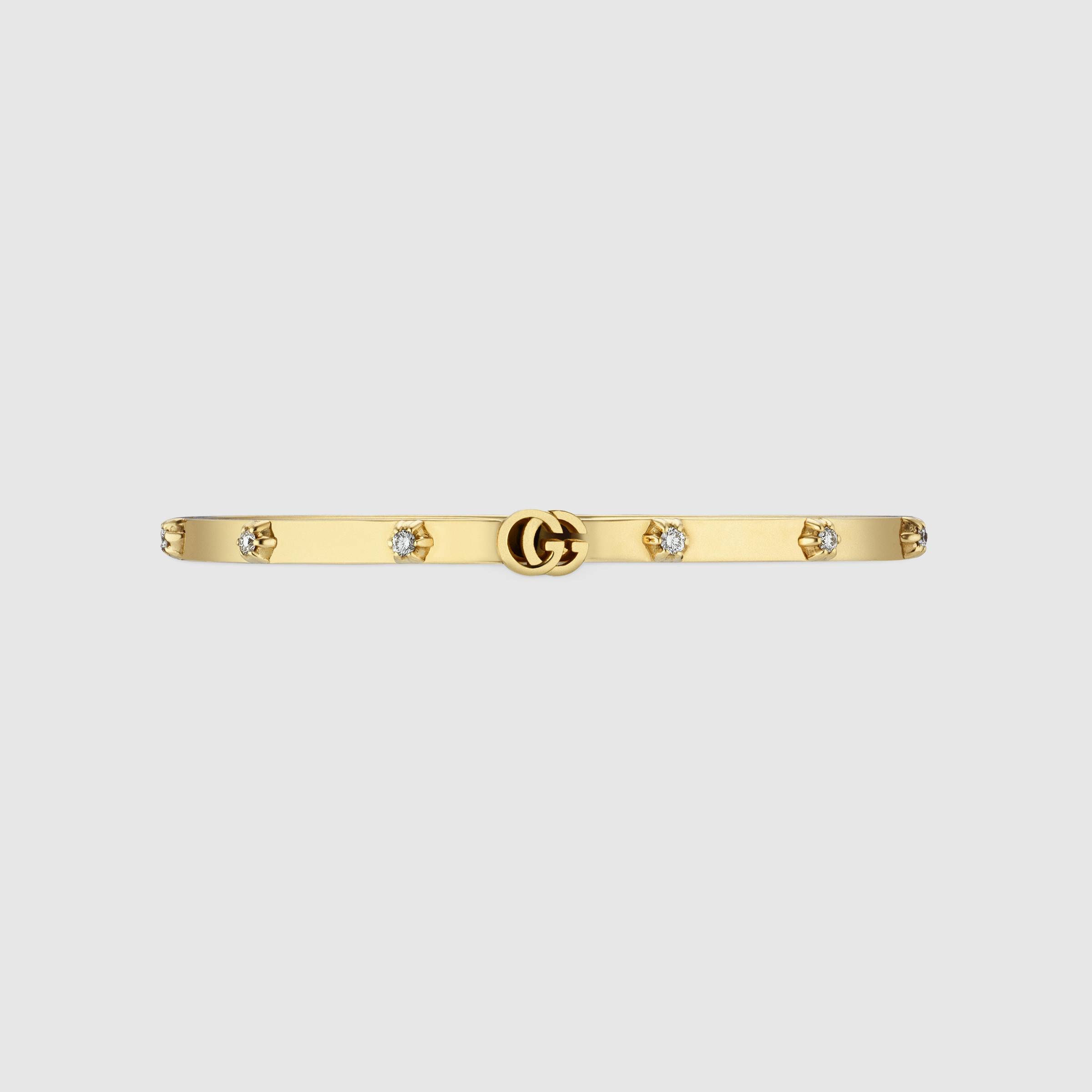 A rigid 18K yellow gold bracelet set with white diamonds. The centrepiece is the Double G, the brand’s code inspired by the 1970s.