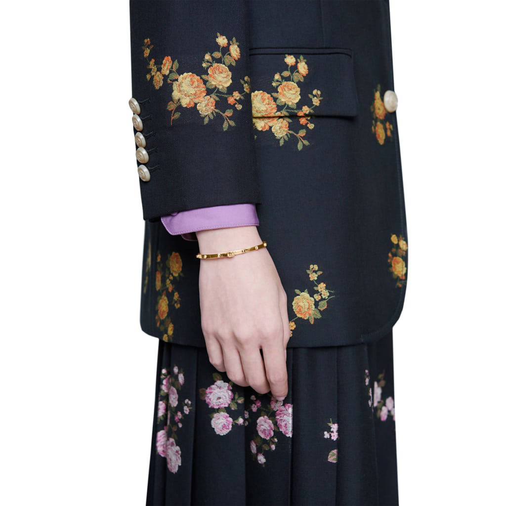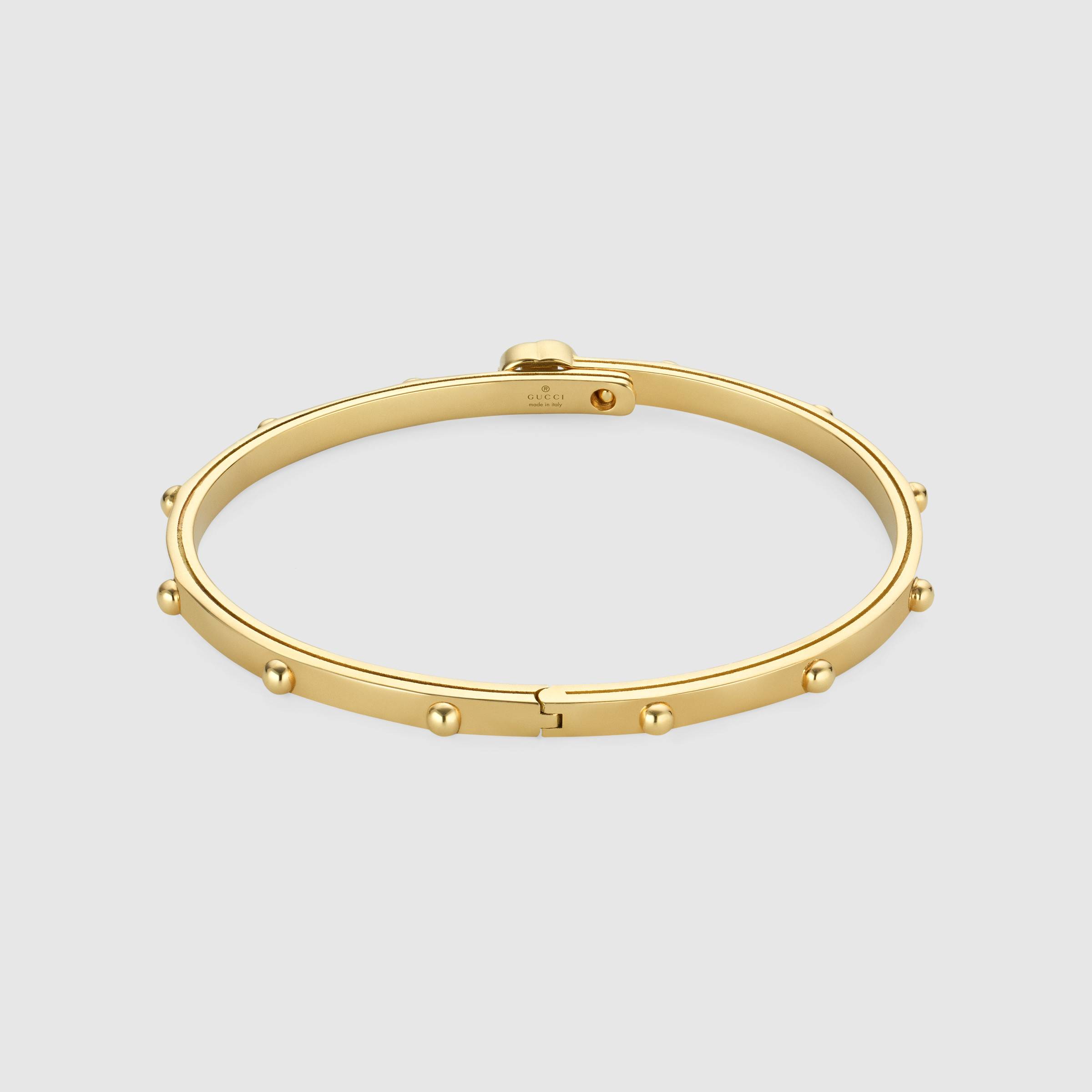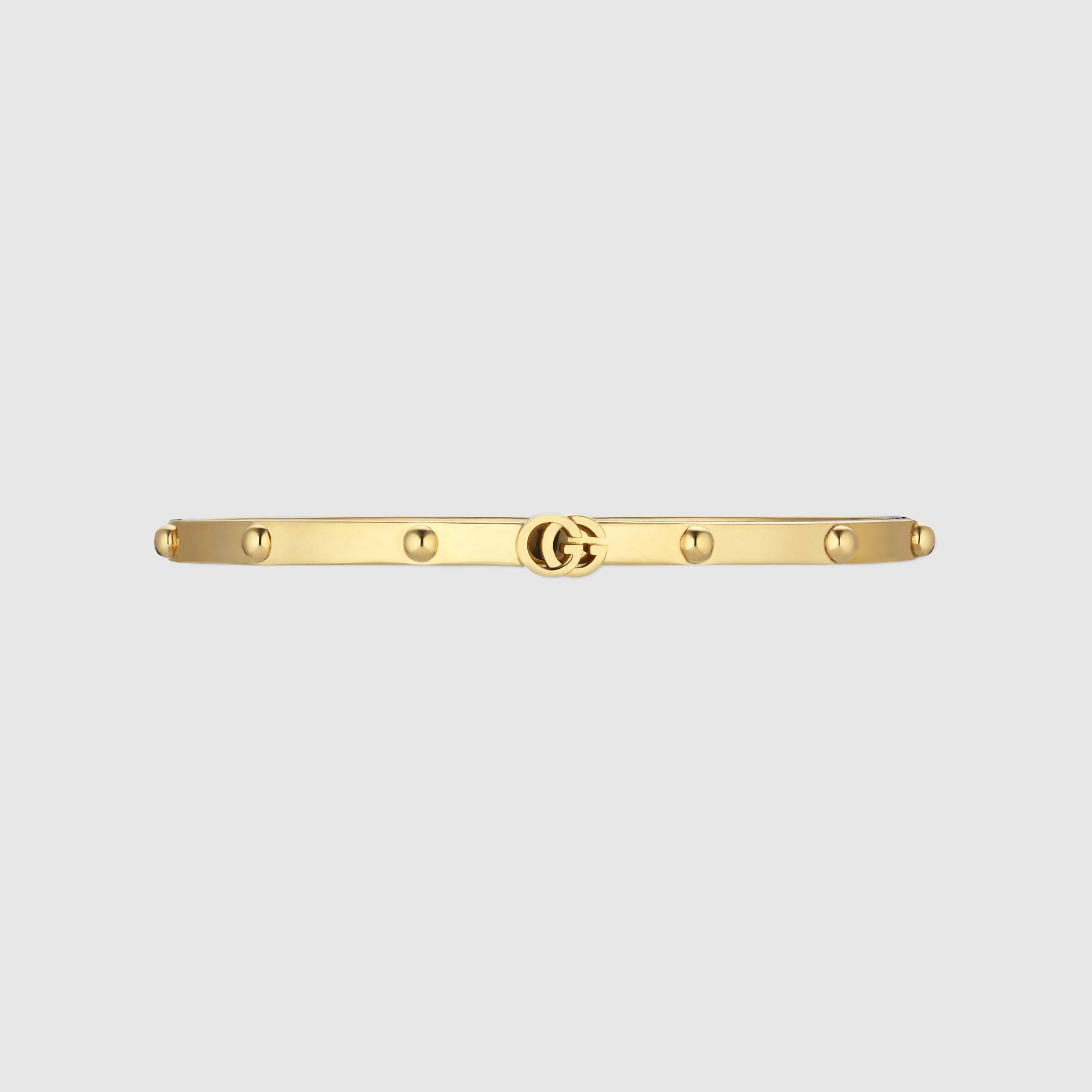 A rigid bracelet in 18k yellow gold, decorated with micro studs. At the center, the Double G stands out, the house’s code inspired by the 70s.