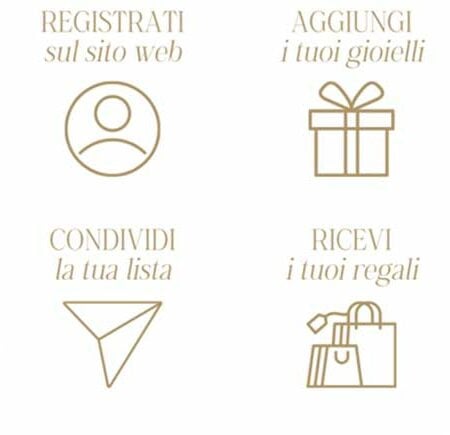 Registrati sul sito, naviga il catalogo e aggiungi i gioielli che preferisci alla tua lista. Condividila e ricevi i tuoi regali direttamente a casa!