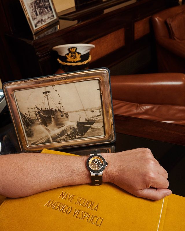 Omaggio al leggendario veliero Amerigo Vespucci ed allo spirito d’avventura che esso rappresenta. Dotato di una complicazione particolarmente apprezzata dai viaggiatori contemporanei, l’orologio presenta un quadrante nero, giallo e bianco, ispirato agli iconici colori del veliero.