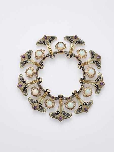 Lillian Nassau, esponente dei commercianti di oggetti d’antiquariato di New York, e una delle prime in America a vedere un mercato in Art Nouveau e Art Deco, donò questa splendida collana Lalique al MET di New York, databile intorno al 1897–99 composta da oro, opale, smalti ed ametiste, magistralmente lavorata, così come solo Lalique sapeva immaginare.