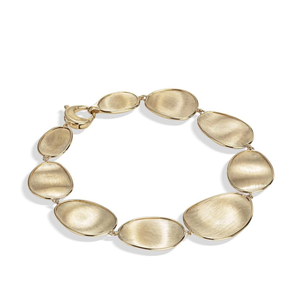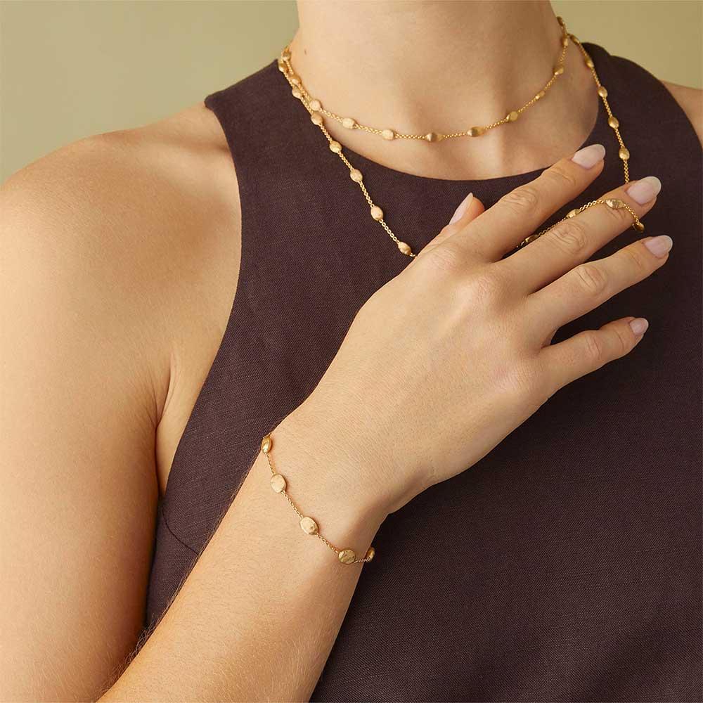 Una reinterpretazione della classica catena, rivisitata in chiave contemporanea per uno stile senza tempo. Jaipur Link è un susseguirsi di elementi circolari ad anello, agganciati l’un l’altro in un gioco tridimensionale di straordinari volumi, che dà vita a una catena irregolare dall’eleganza sofisticata. Anche in questa linea l’oro giallo è rigorosamente a 18 carati, finemente inciso a mano con l’antica tecnica del bulino che dona alle superfici un finish irregolare, satinato e straordinariamente contemporaneo.