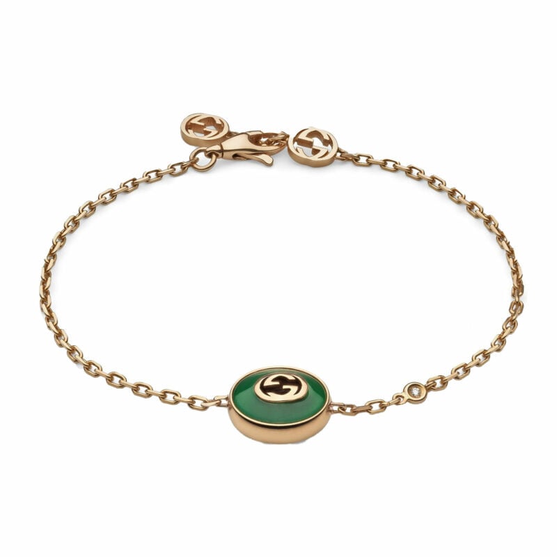 BRACCIALE A CATENA GUCCI INTERLOCKING IN ORO GIALLO CON AGATA VERDE E DIAMANTE 0,008 CT1.980,00€ -