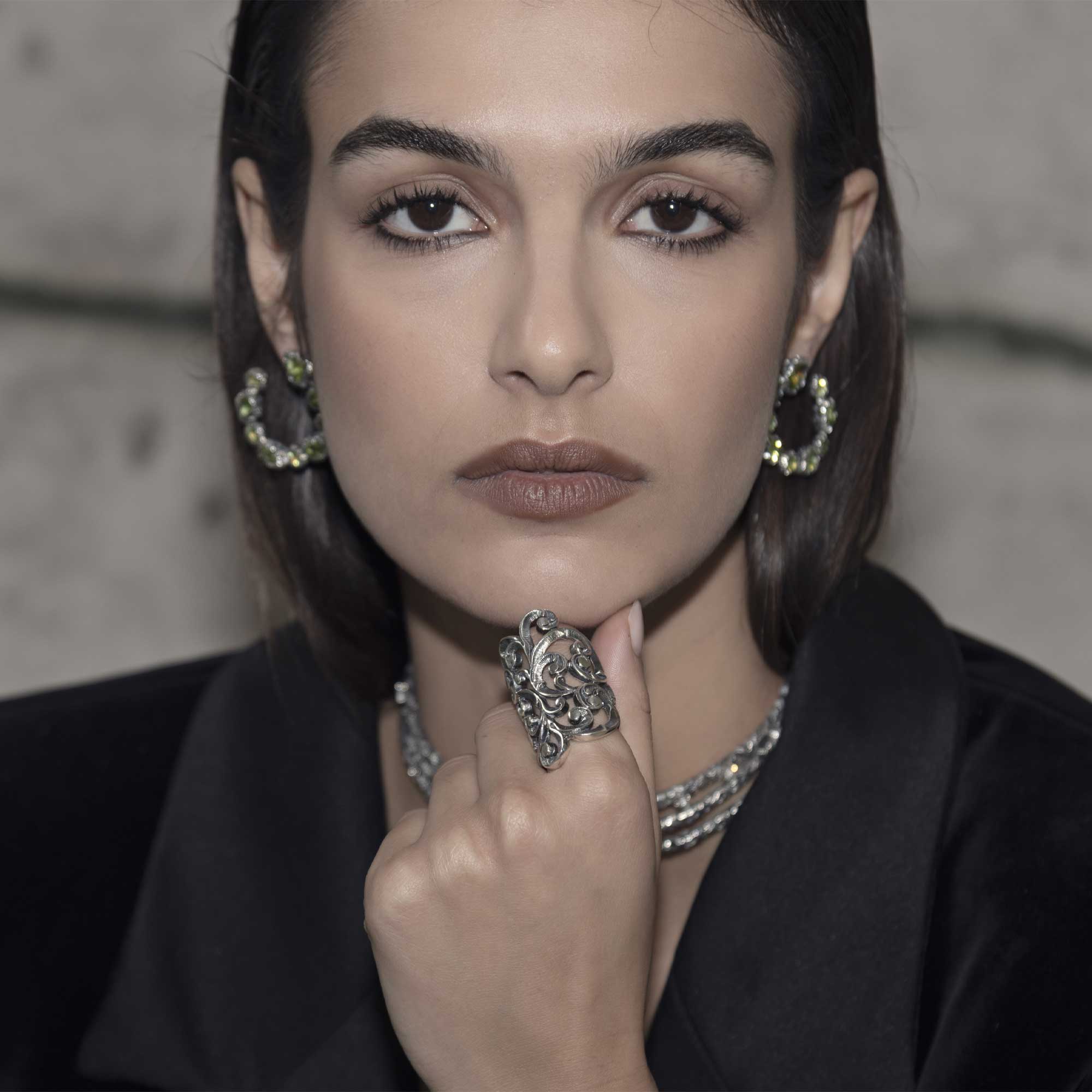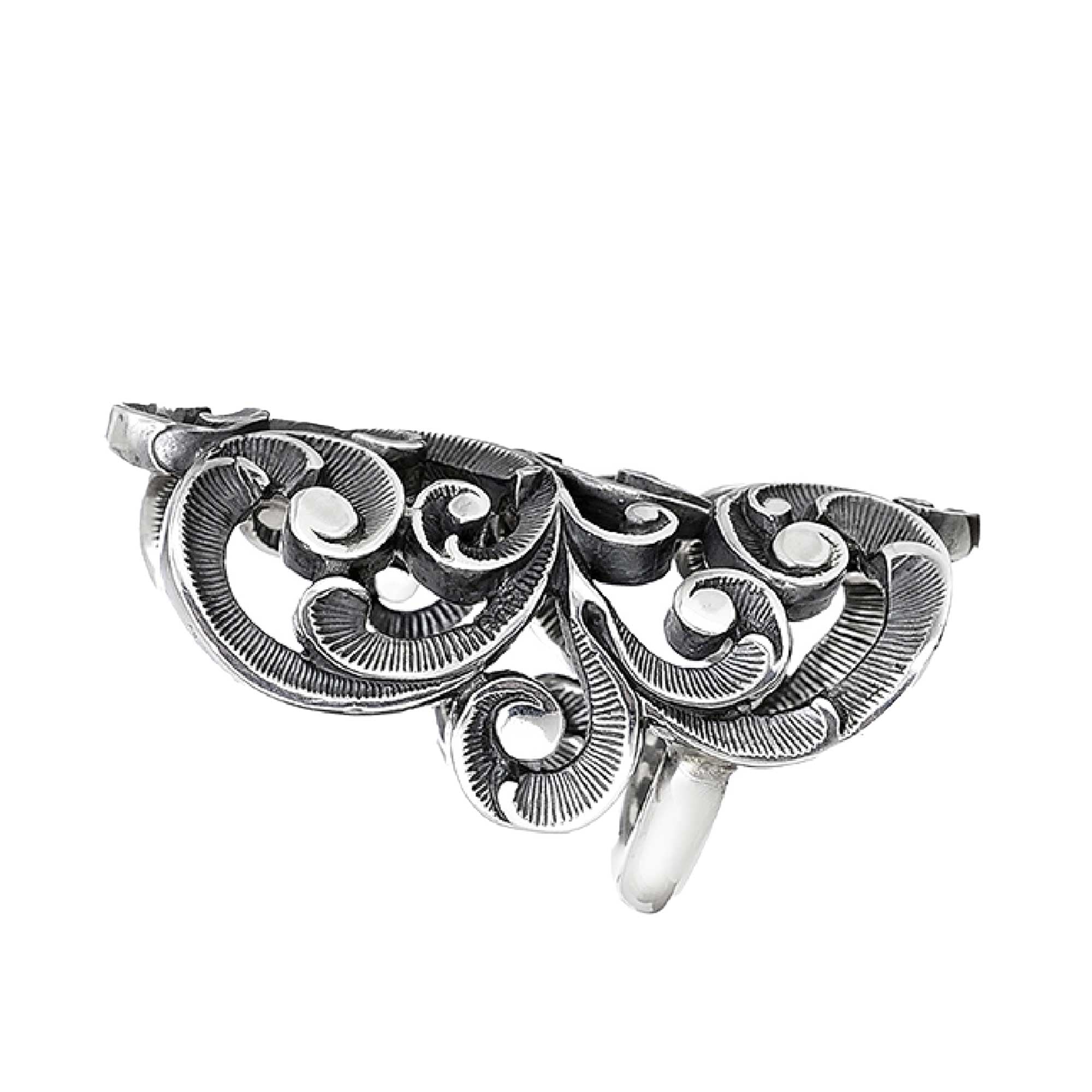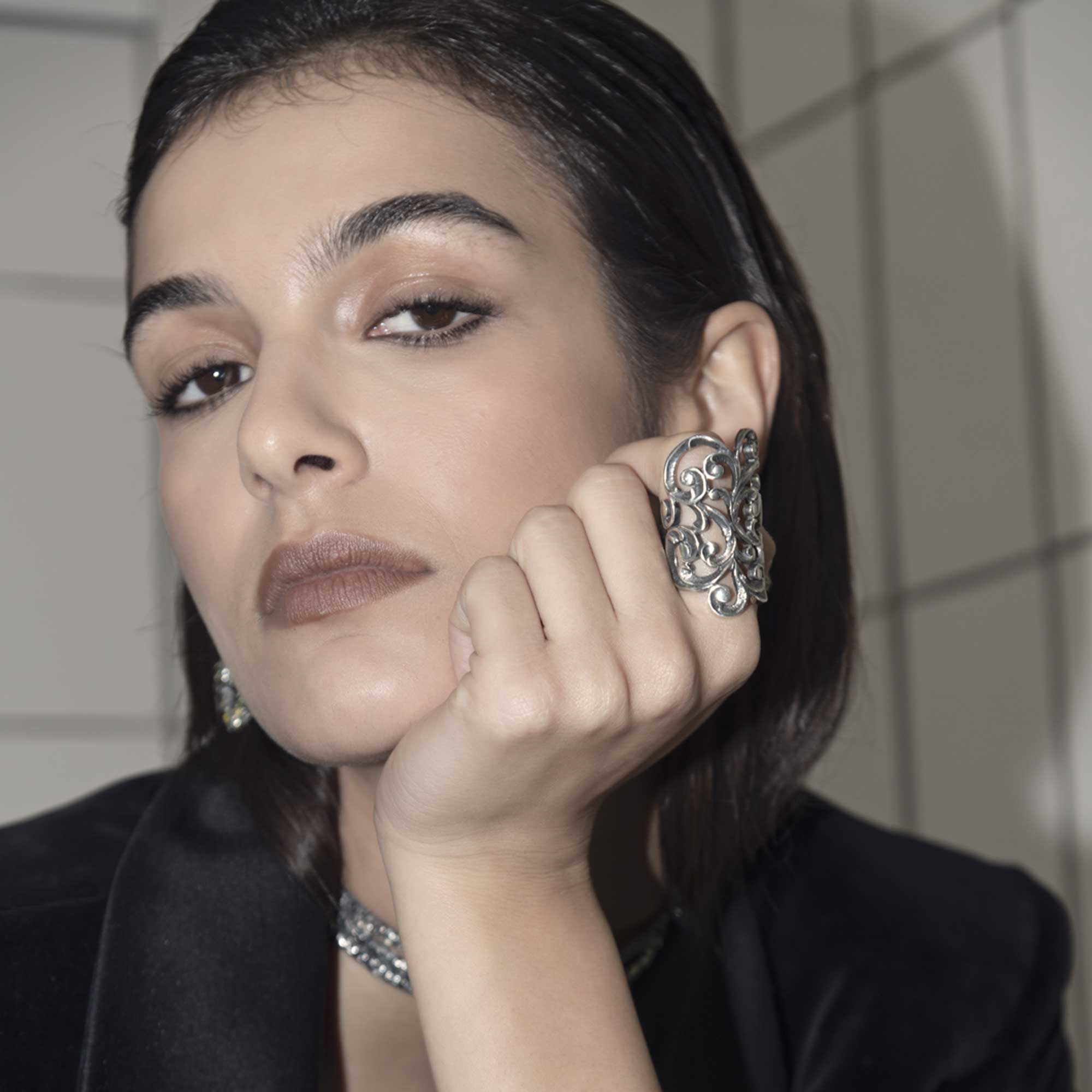 L’anello da falange in argento brunito inciso evoca il gusto di mondi lontani. Questo anello è un’accattivante creazione dallo stile non convenzionale. Per una donna che ama indossare gioielli dalla briosa e irriverente eleganza.