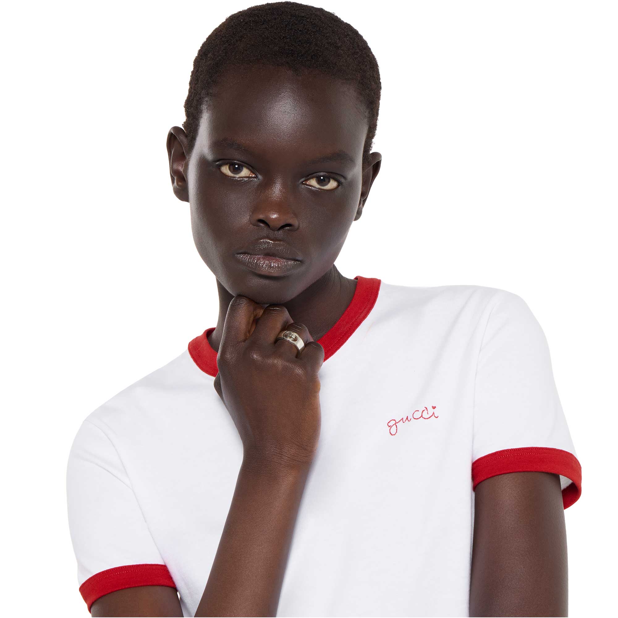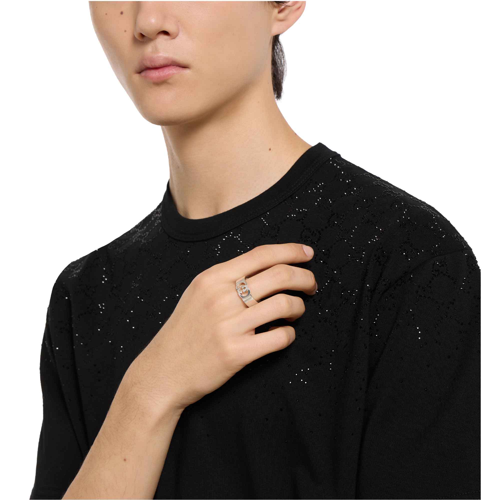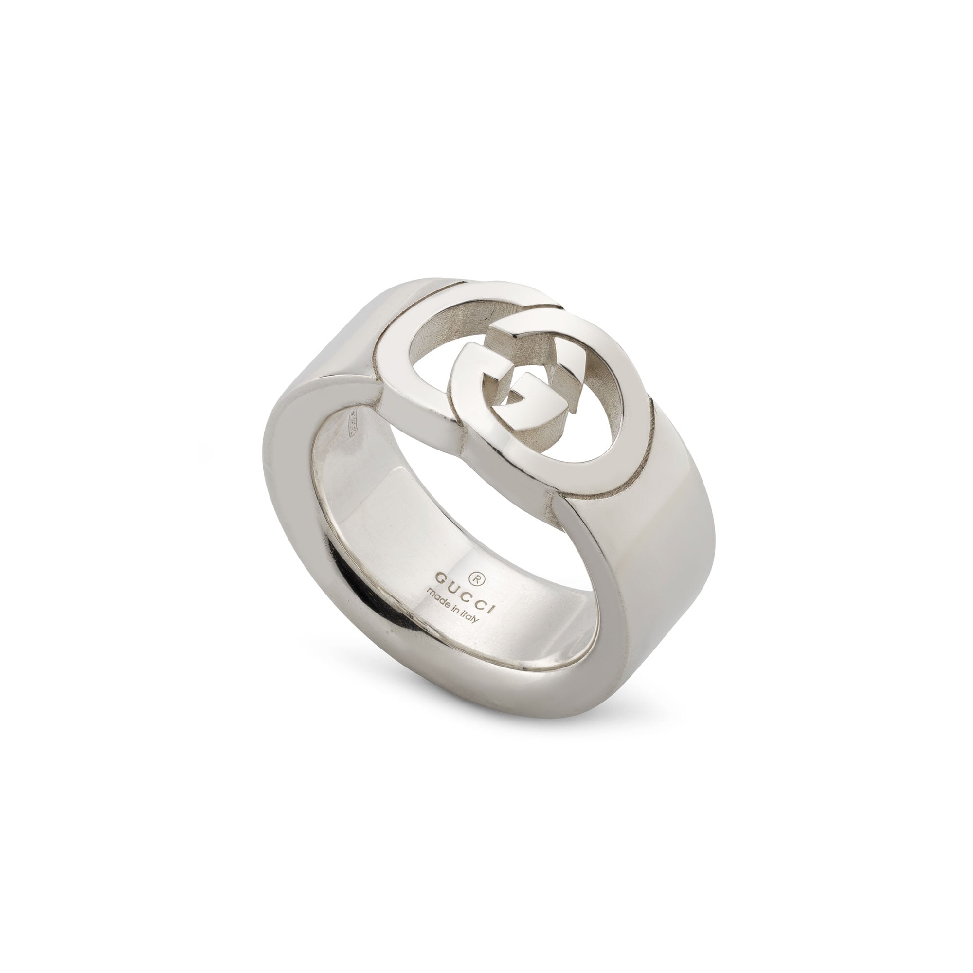 La collezione di gioielli in argento della Maison continua a reinterpretare i motivi emblematici con materiali pregiati e una lavorazione artigianale elaborata, come nel caso di questo anello chevalier caratterizzato dal dettaglio Incrocio GG in versione cut-out.