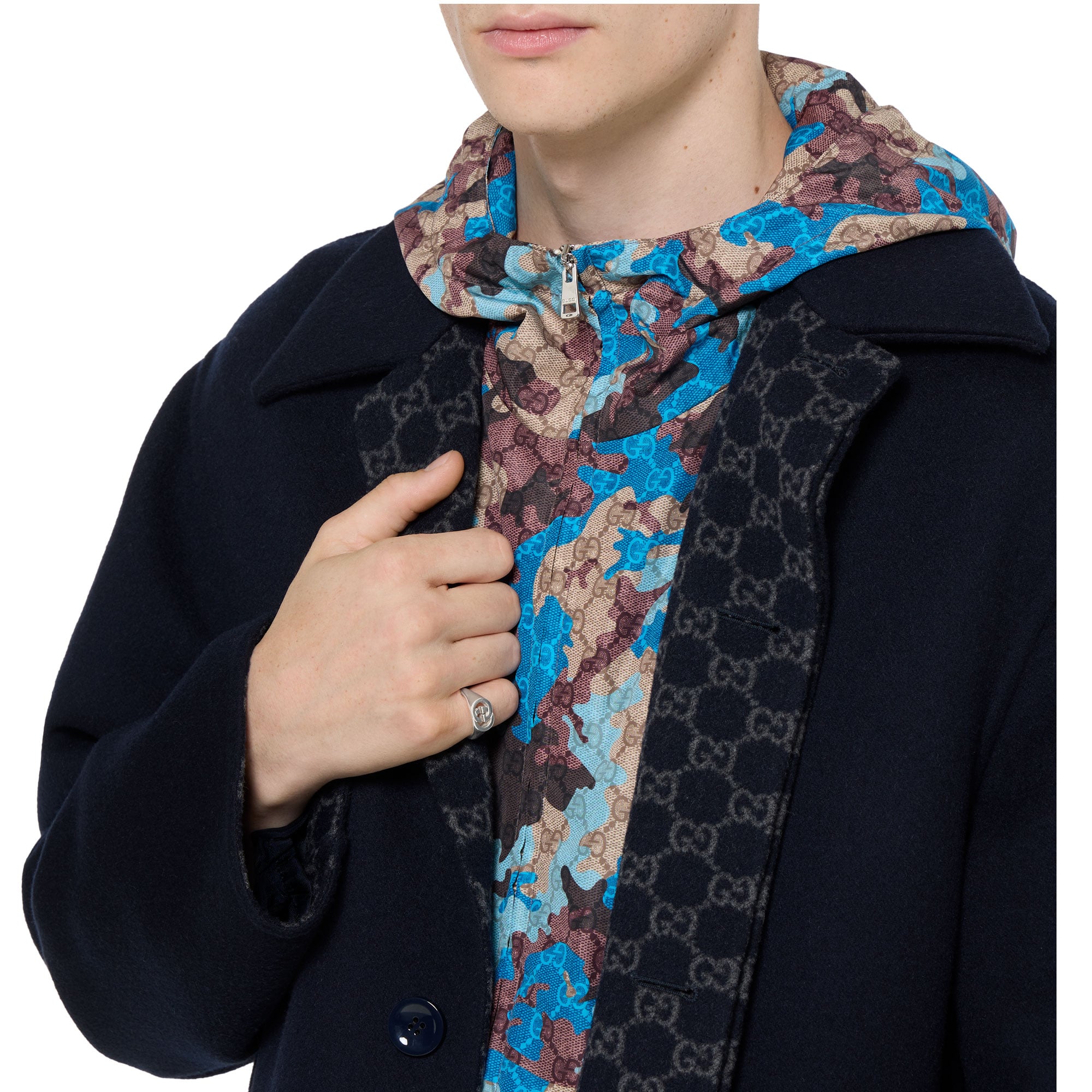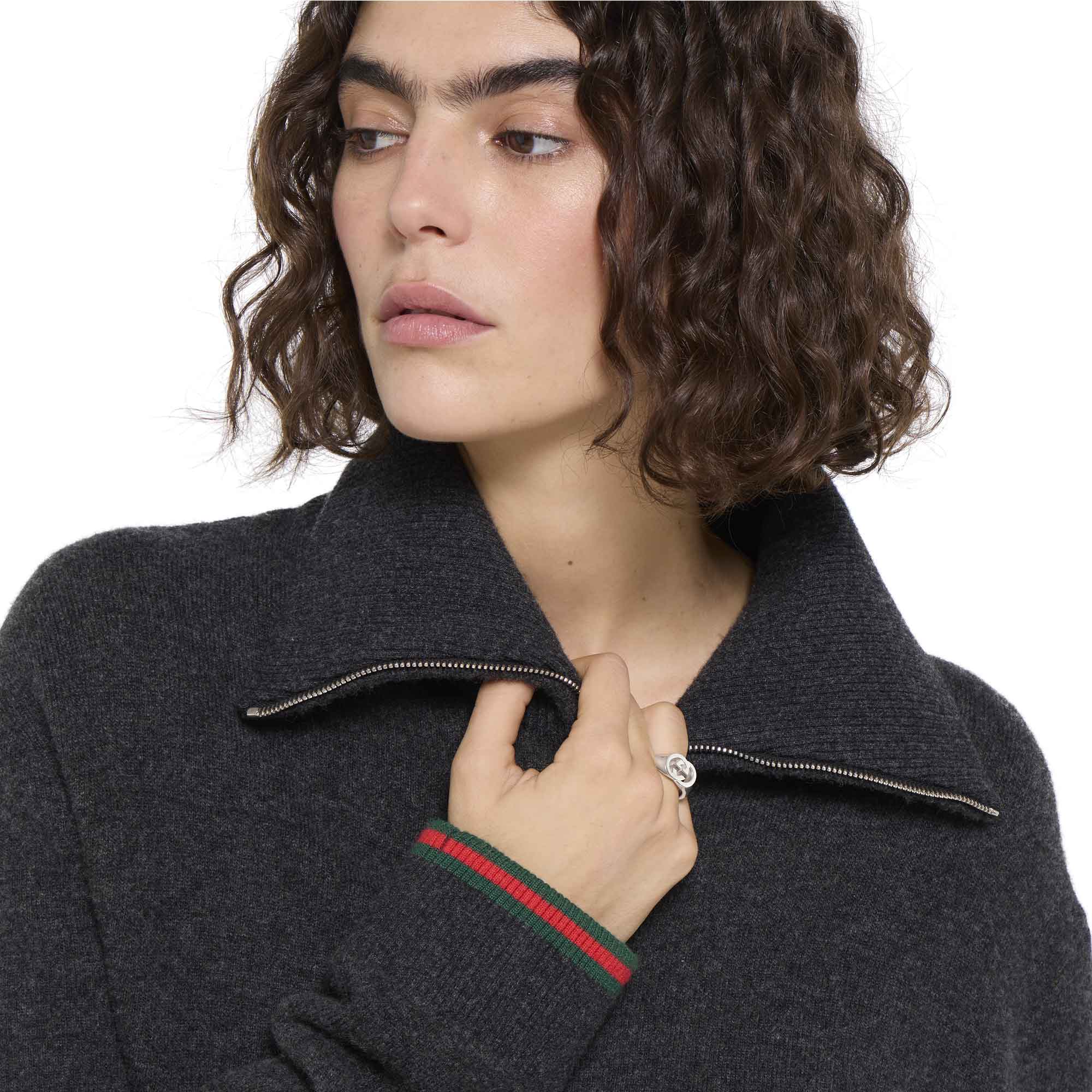 La collezione di gioielli in argento della Maison continua a reinterpretare i motivi emblematici con materiali pregiati e una lavorazione artigianale elaborata, come nel caso di questo anello con sigillo impreziosito dal motivo Incrocio GG.