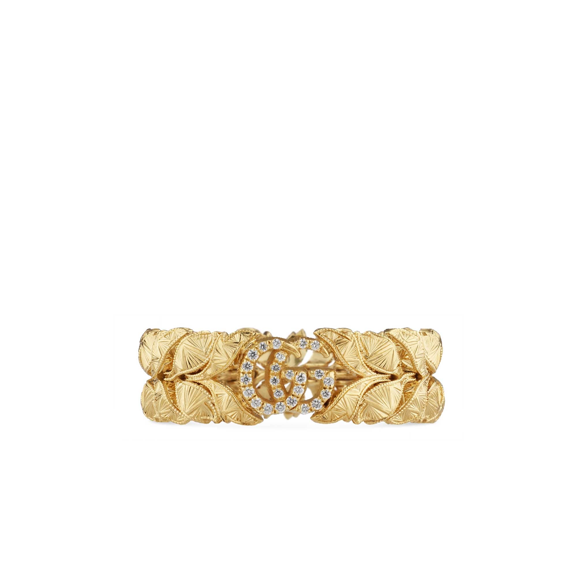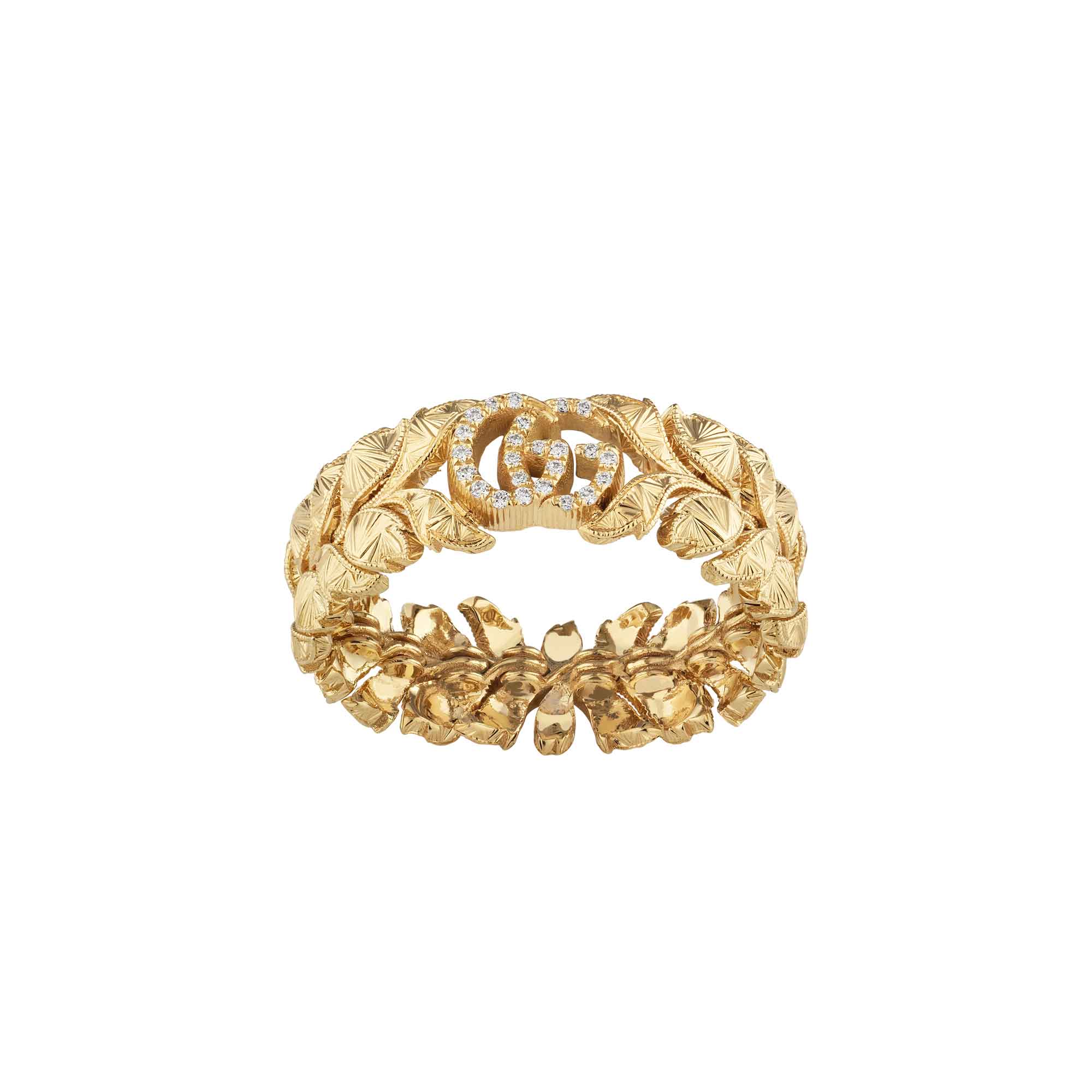 SKU: 702376J85408000Parte di Gucci Flora, questo anello in oro giallo 18 carati presenta piume delicatamente incise e l’emblematico logo Doppia G. Incastonato di diamanti, il motivo della Maison arricchisce la silhouette con un tocco glamour.