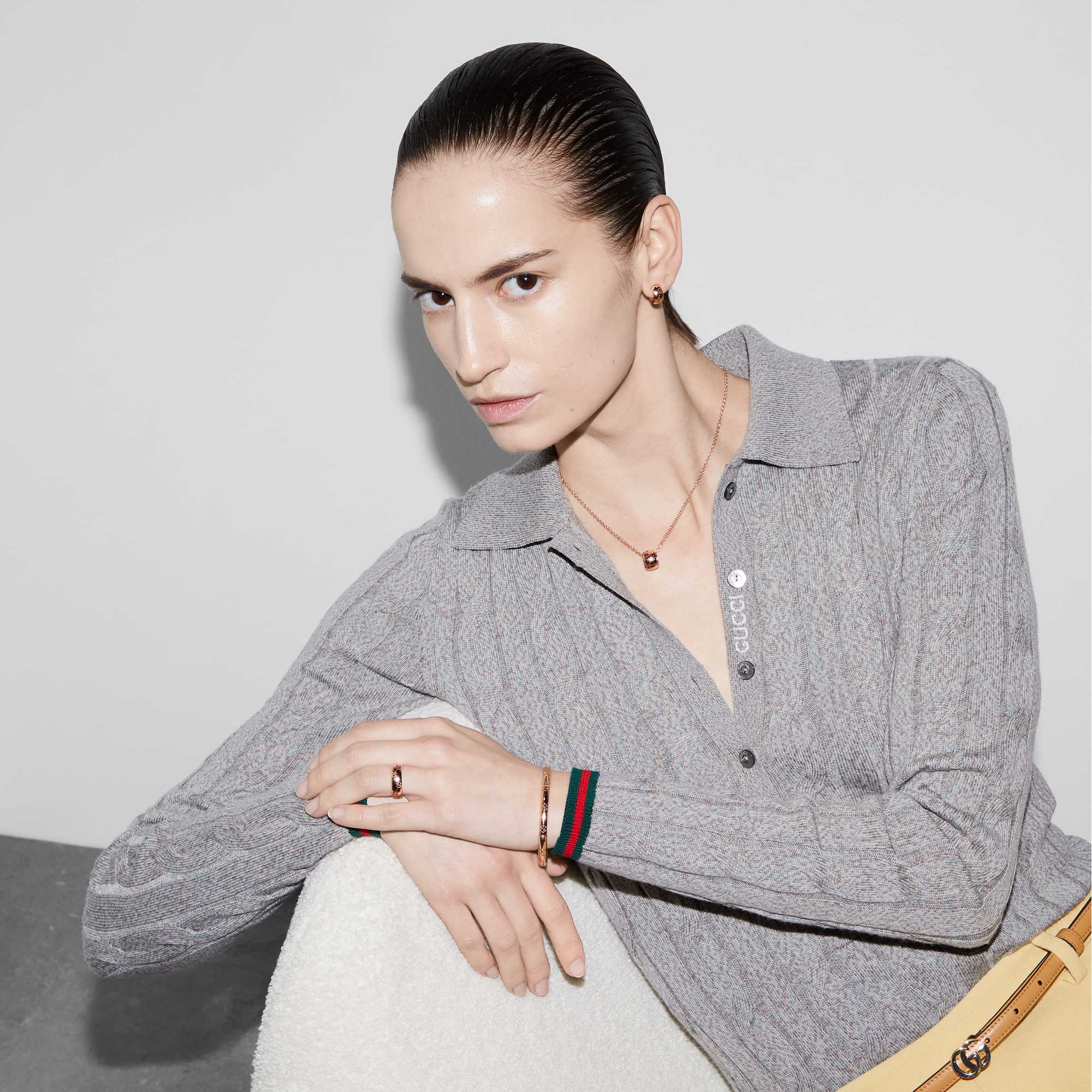 Per la collezione Autunno Inverno 2024, i gioielli Icon presentano un nuovo motivo GG cut-out sulle silhouette arrotondate. Qui, il caratteristico motivo della Maison impreziosisce questo anello sottile in oro rosa 18 carati.