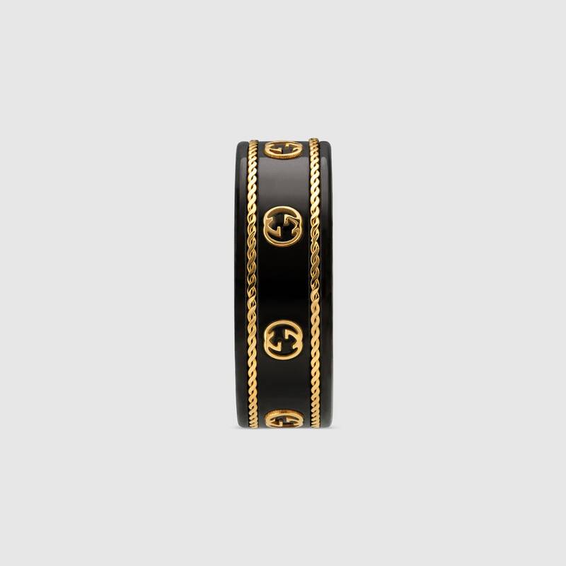 Per la collezione Cruise 2020, la linea Icon riprende un motivo emblematico della Maison. Presentata in oro giallo 18 carati, la GG si contrappone a una fascia in corindone sintetico nero. Profili a treccia completano il gioiello.