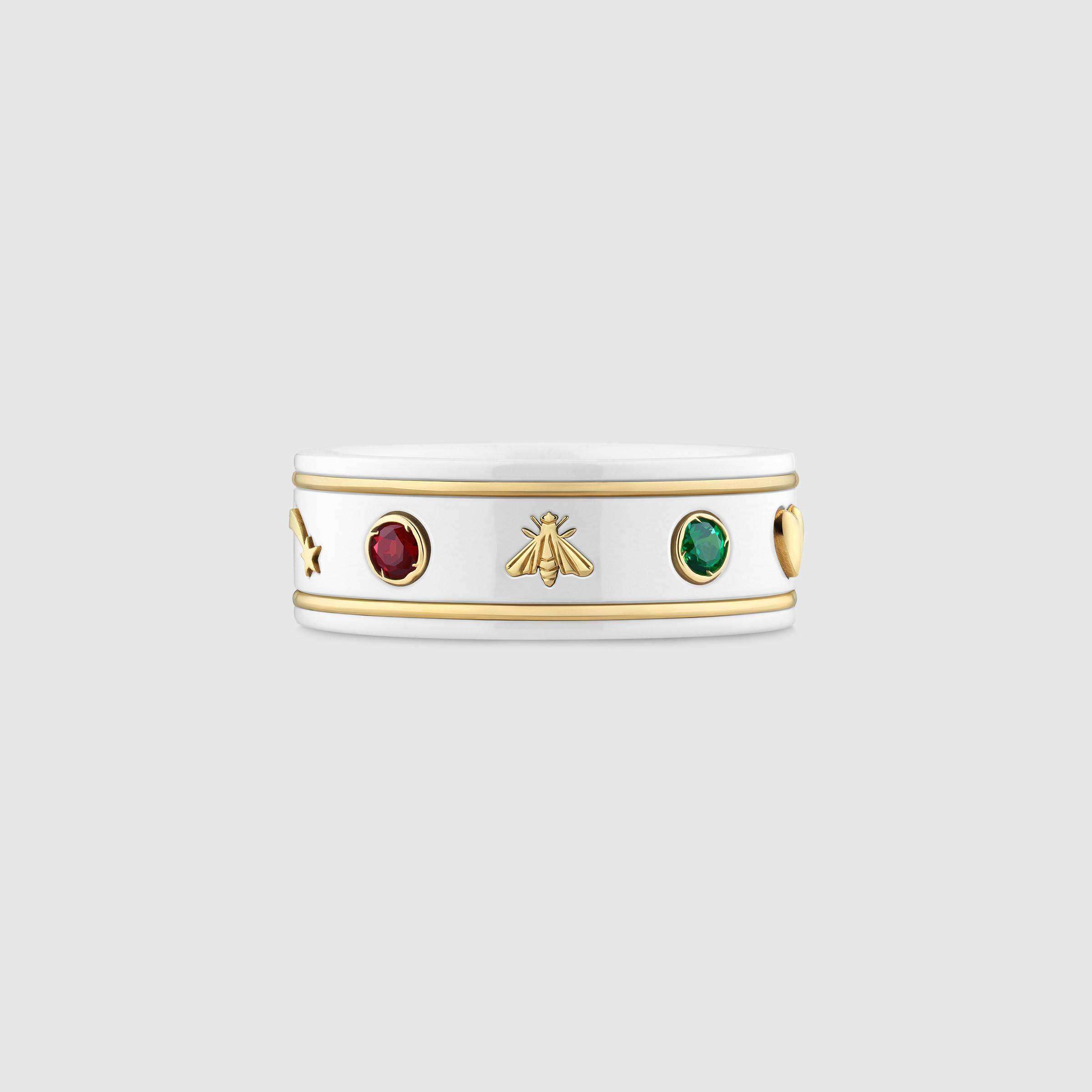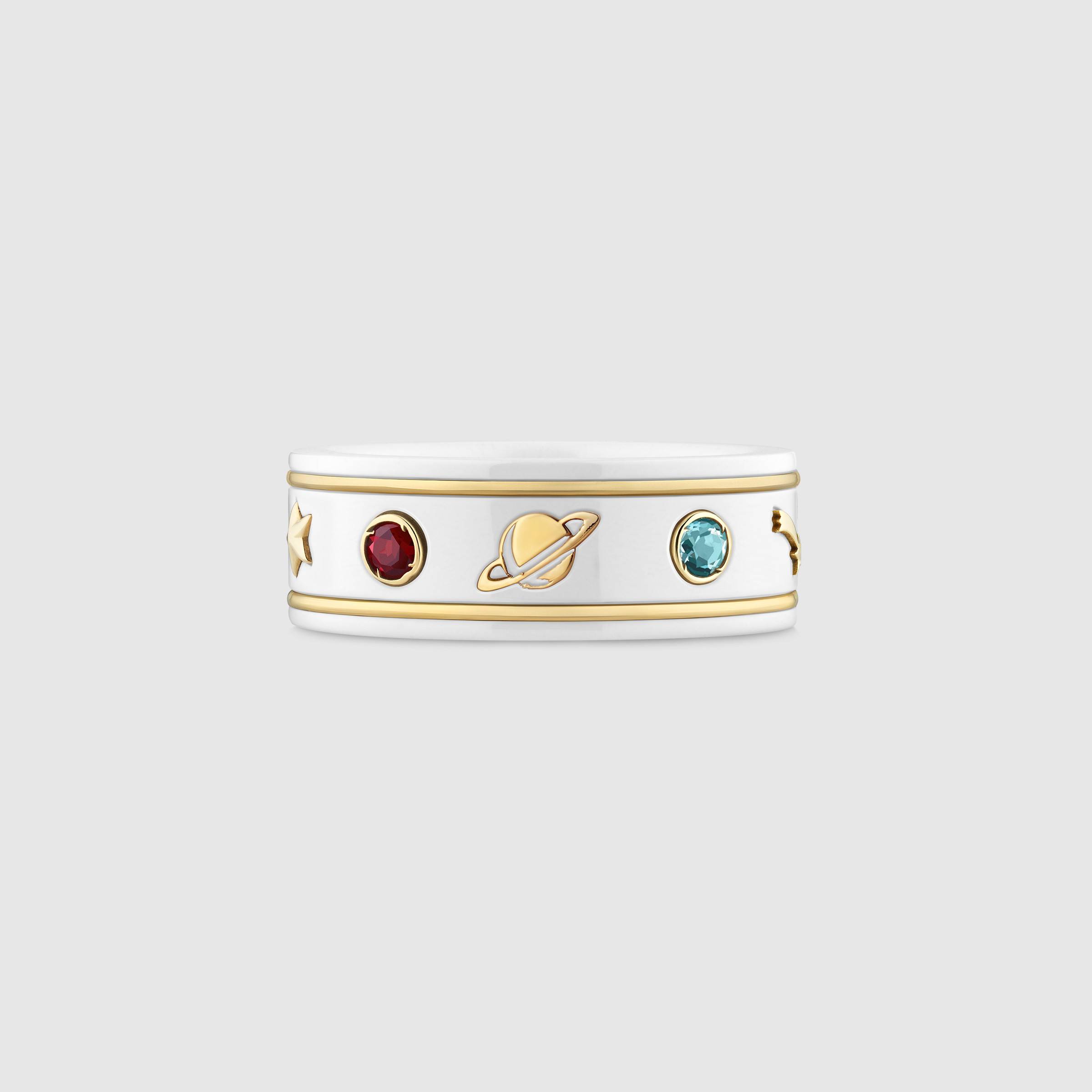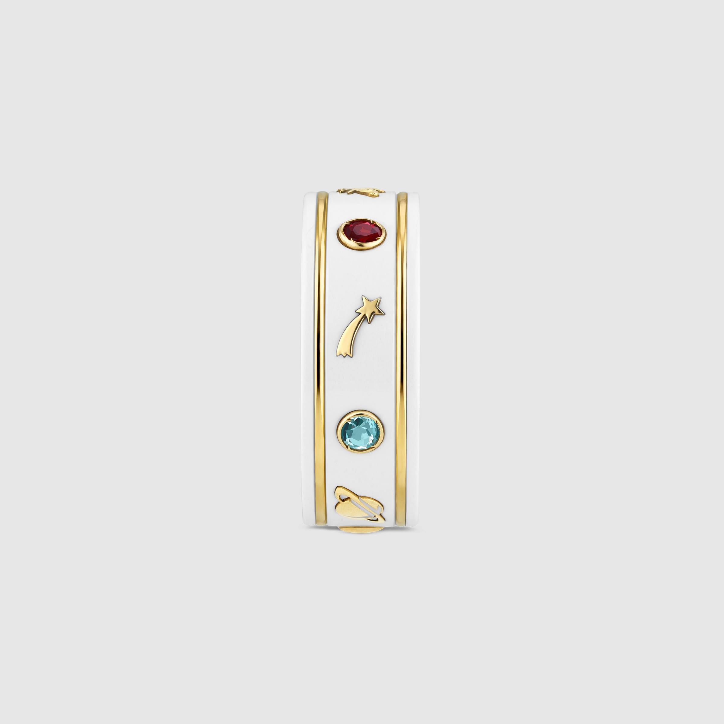 Parte dell’eclettico universo della Maison, la collezione Icon si evolve con l’introduzione di nuovi motivi emblematici del mondo Gucci. Piccoli simboli in oro giallo 18 carati come il pianeta, la stella, l’ape e il dettaglio GG contrastano una fascia in zirconia bianca e si alternano a pietre colorate