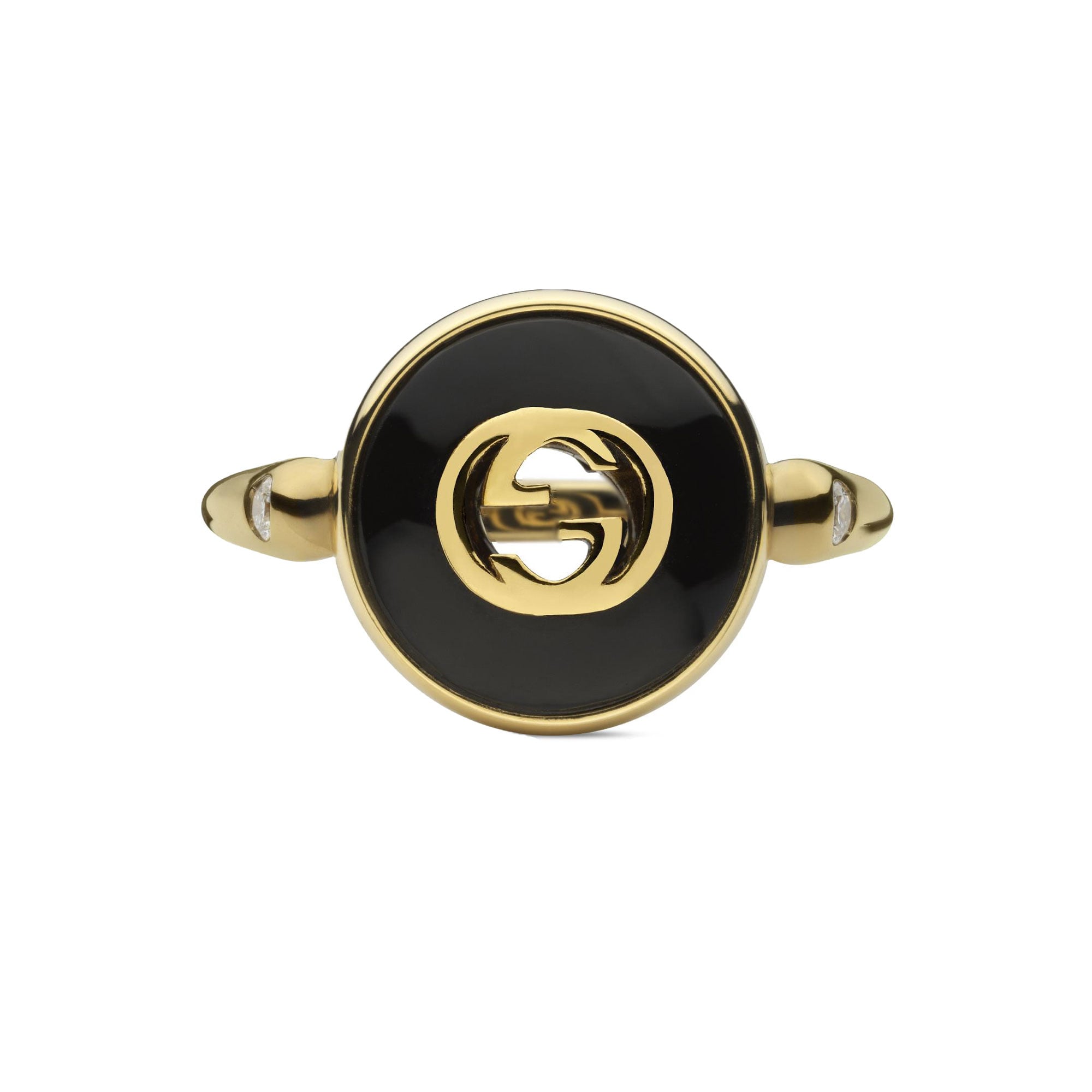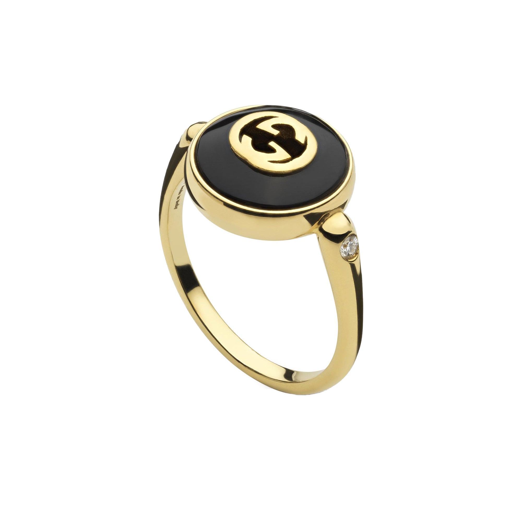 ANELLO GUCCI INTERLOCKING IN ORO GIALLO CON ONICE NERA E DIAMANTI 0,042 CT