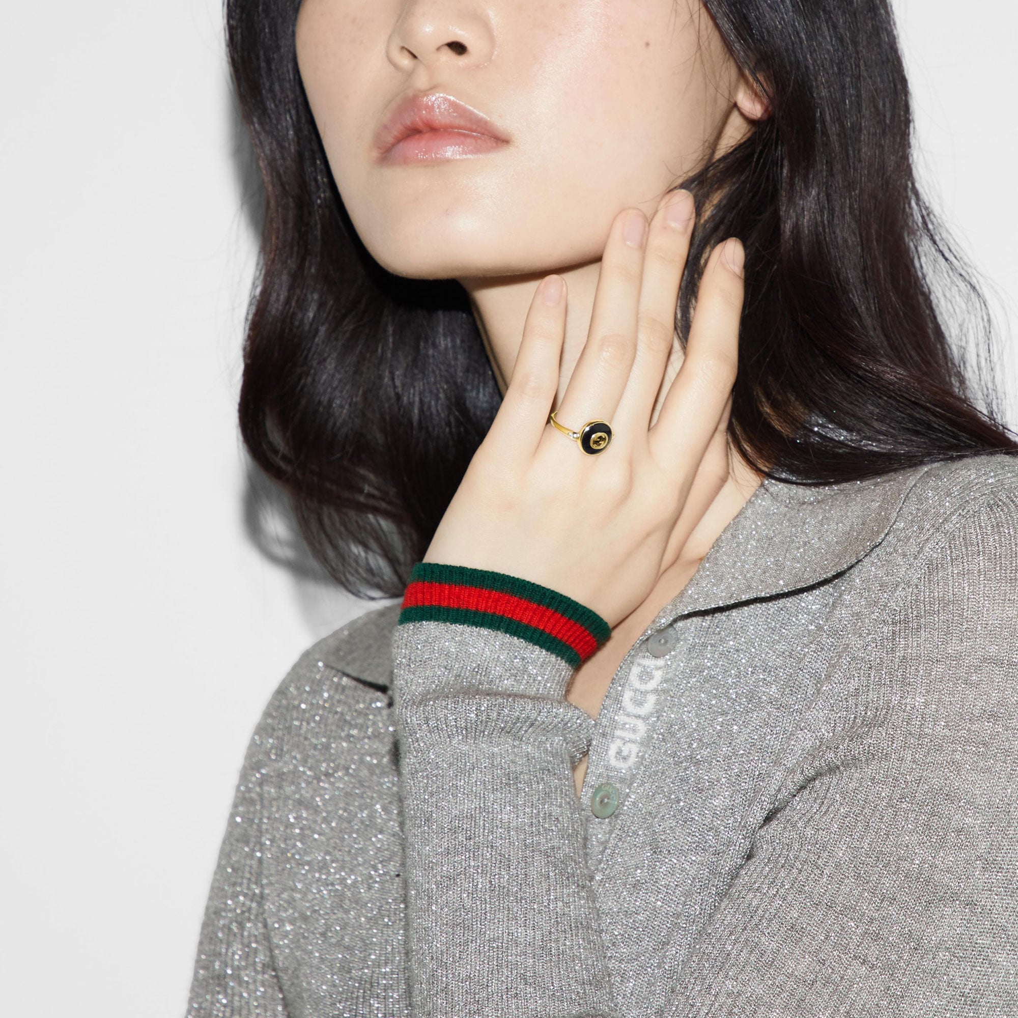 Il logo Incrocio GG è presentato in nuove ed eleganti versioni per la collezione Pre-Fall 2024. La preziosa pietra di onice nero è abbinata all’oro giallo 18 carati ed impreziosita da diamanti. Questo anello può essere indossato con altri accessori della stessa linea.