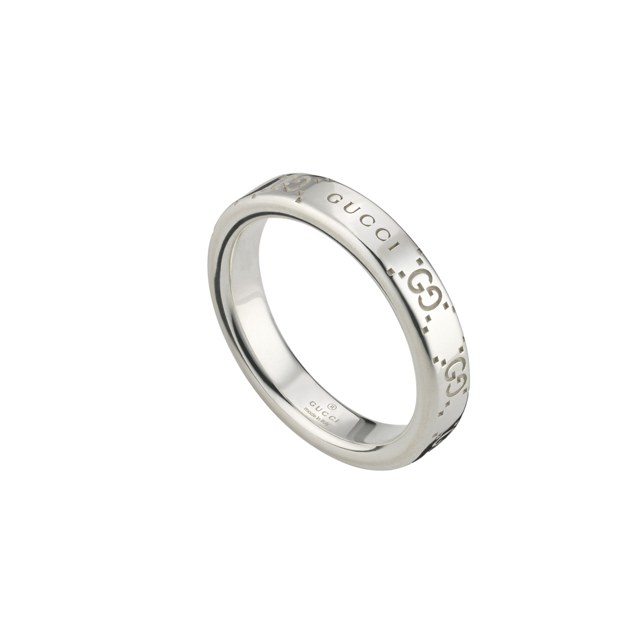 Il motivo GG ritorna e viene riproposto su una selezione di capi e accessori per tutti i giorni dal tocco contemporaneo e facili da indossare. L’incisione dell’emblematico design del logo con puntini decora la base in argento sterling lucido rivestito da una lamina che ne riduce l’ossidazione. Qui il motivo GG adorna e impreziosisce un anello classico.