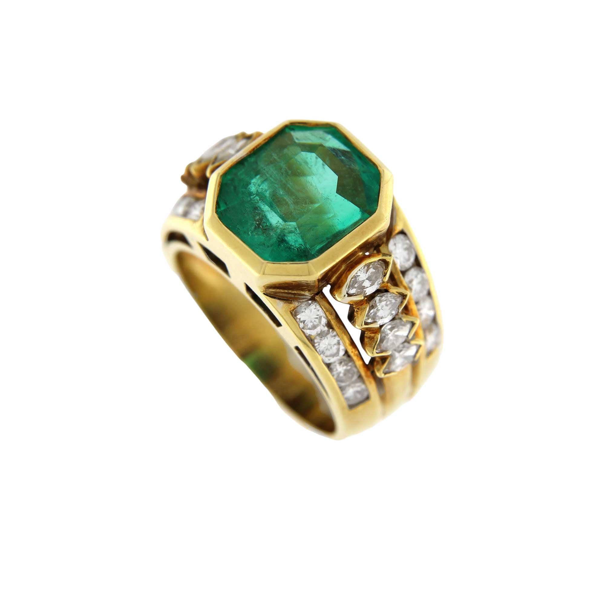 Anello in oro giallo con smeraldo colombiano circa ct.8, 16 brillanti ct.circa 0,80 e 8 marquise ct.circa 0,80. Anni 90.