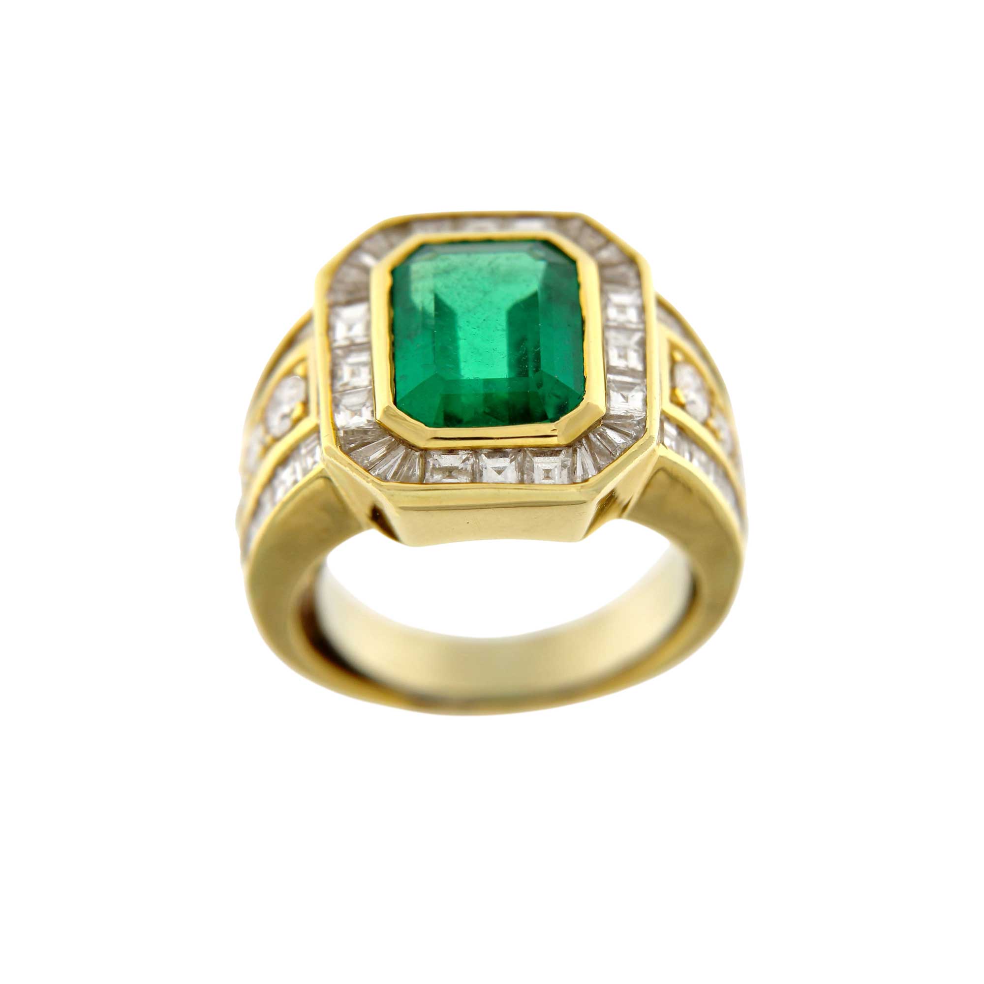 SKU: M4164Anello in oro giallo con smeraldo e diamanti taglio carré.