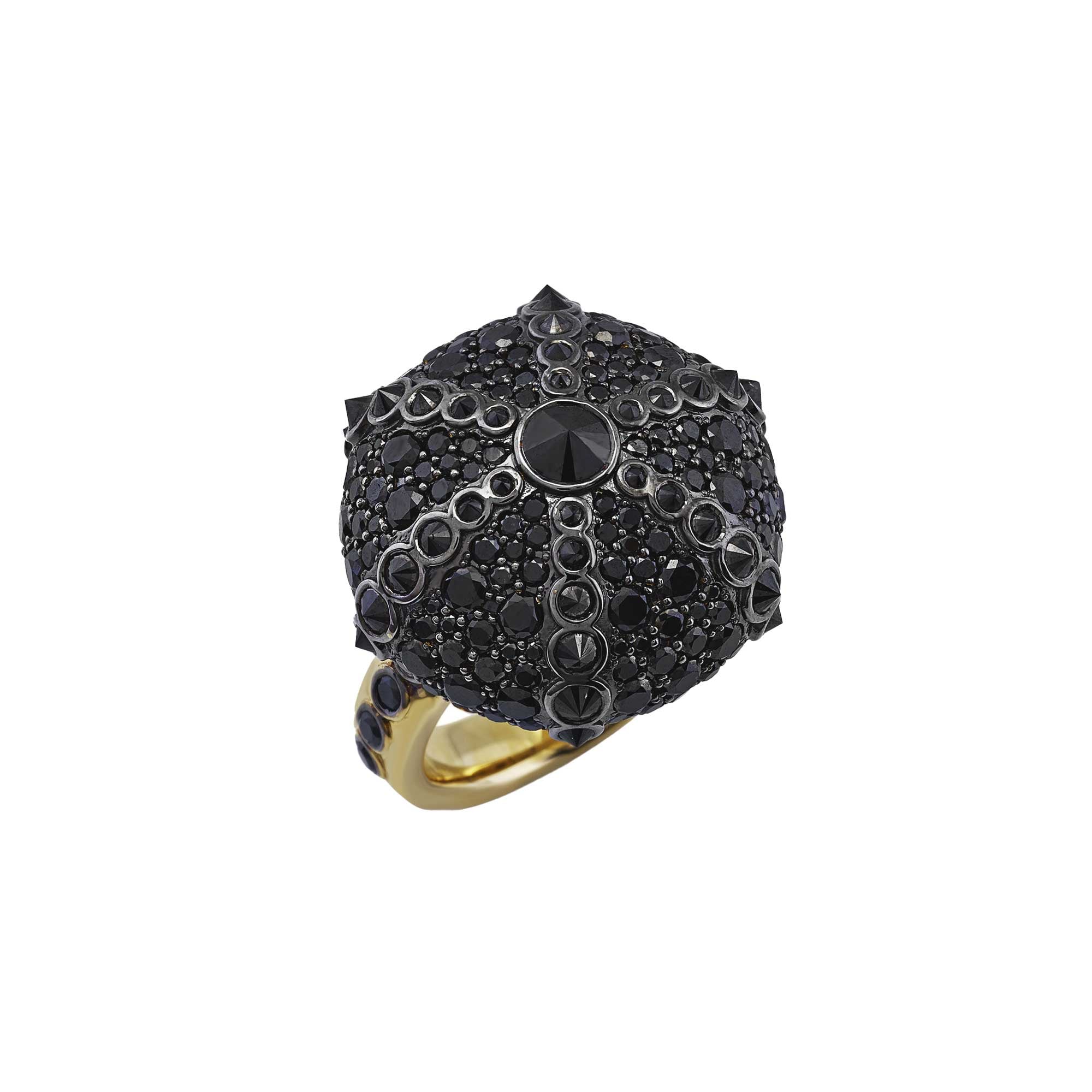 SKU: 43101Anello ricci di mare con testa in oro bianco brunito, diamanti neri e gambo in oro giallo.