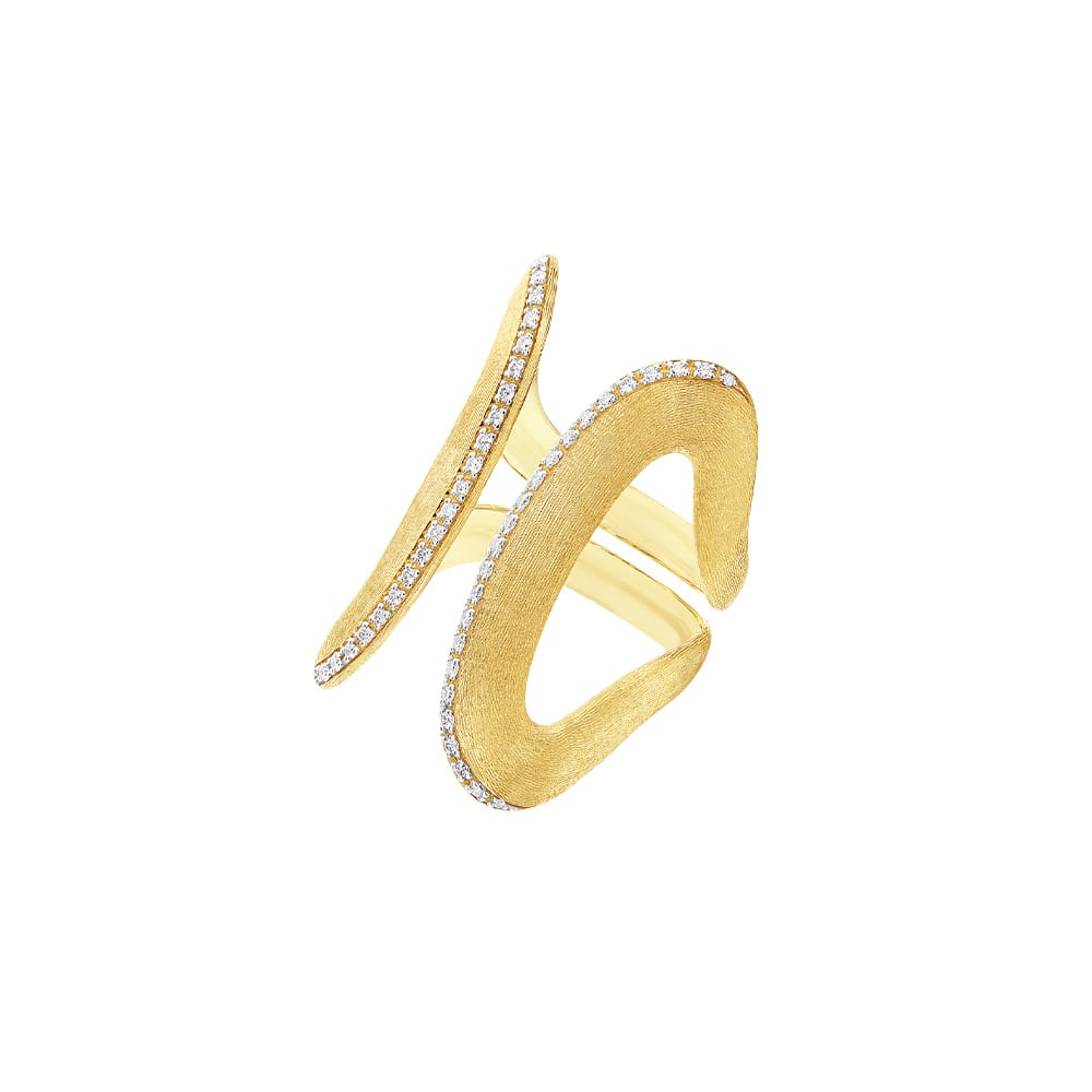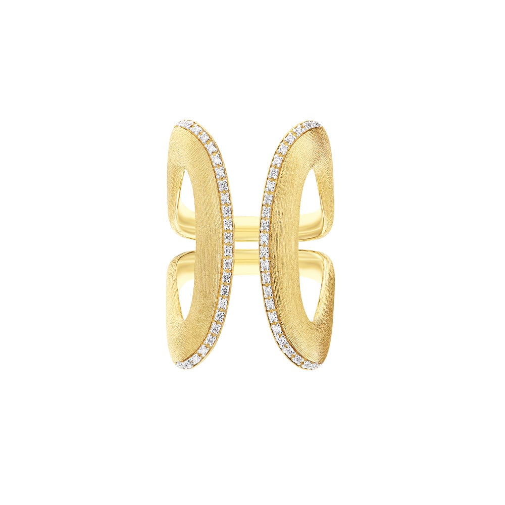 Una geometria sinuosa e nuova contraddistingue questo anello in oro 18kt e diamanti, che sembra adagiarsi sulla mano come una farfalla. Un piccolo capolavoro di artigianalità della collezione ICON.
