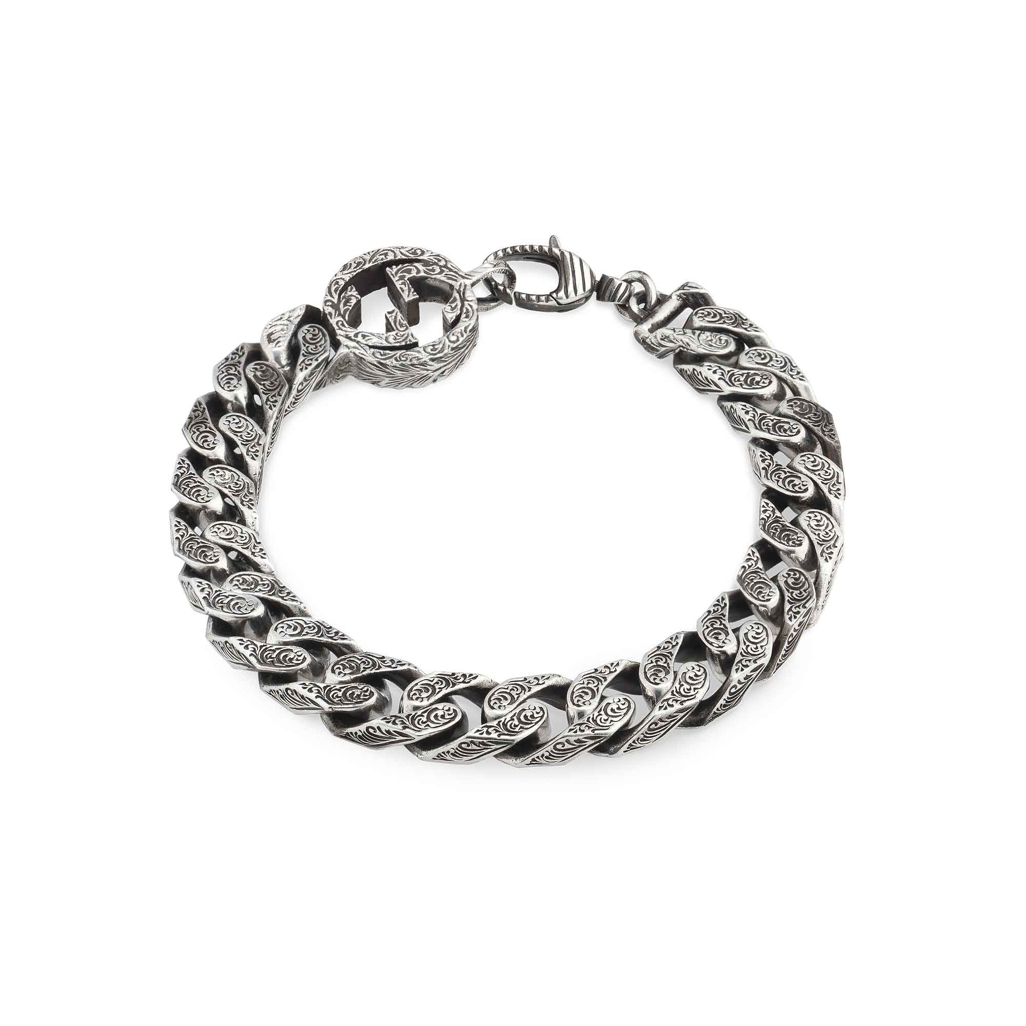 SKU: 454285 J8400 0811Spesso bracciale con catena in argento 925 con elaborato motivo inciso e dettaglio Doppia G.