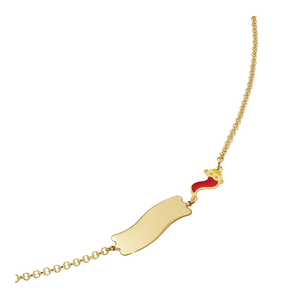 SKU: PMG035/BBracciale “Fortuna” in oro giallo 9kt con cornetto smaltato e targhetta.