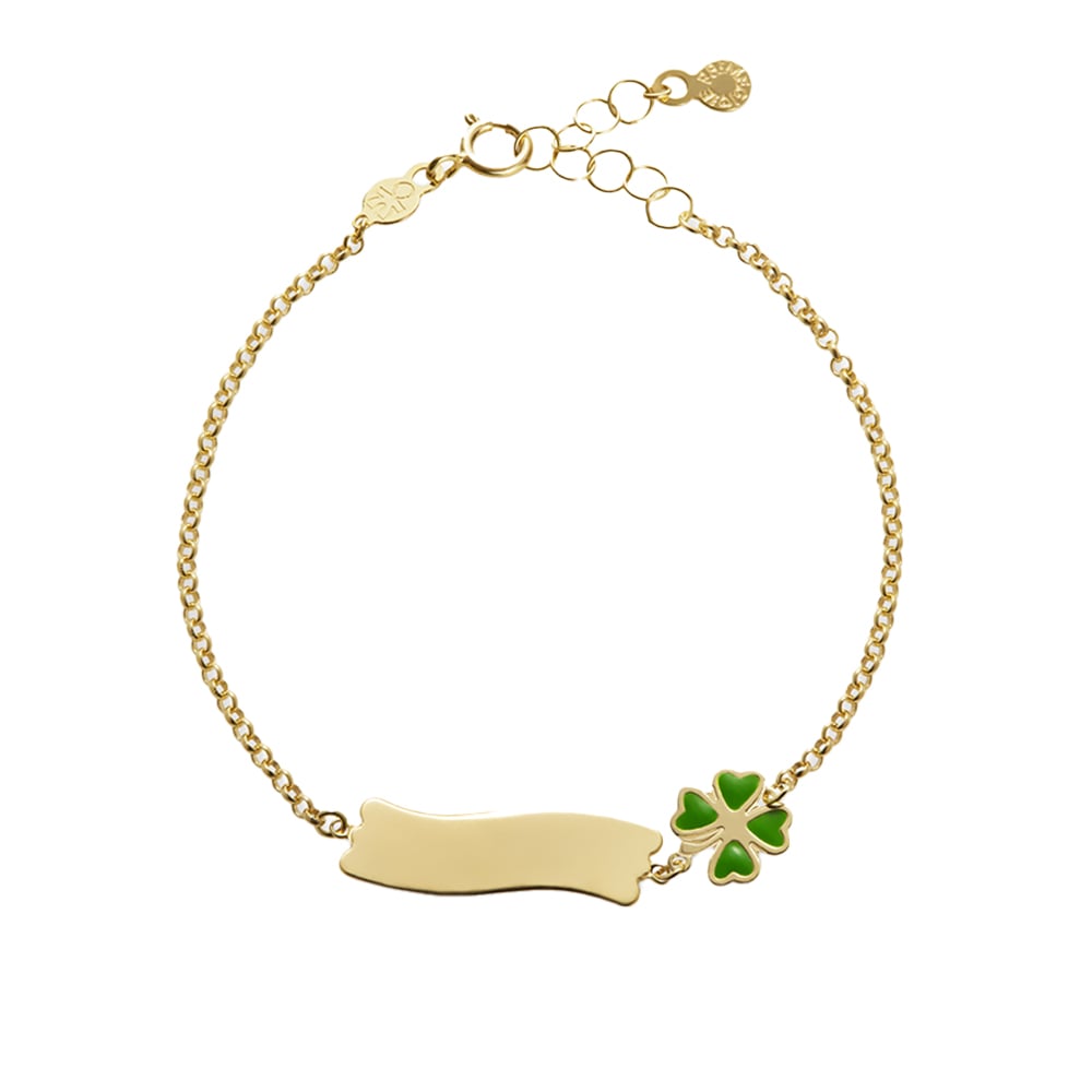 Bracciale “Fortuna” in oro giallo 9kt con quadrifoglio smaltato e targhetta.