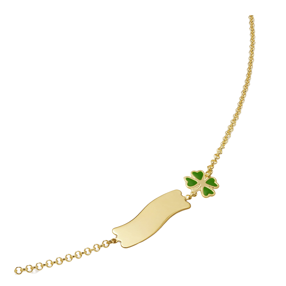 SKU: PMG027/BBracciale “Fortuna” in oro giallo 9kt con quadrifoglio smaltato e targhetta.