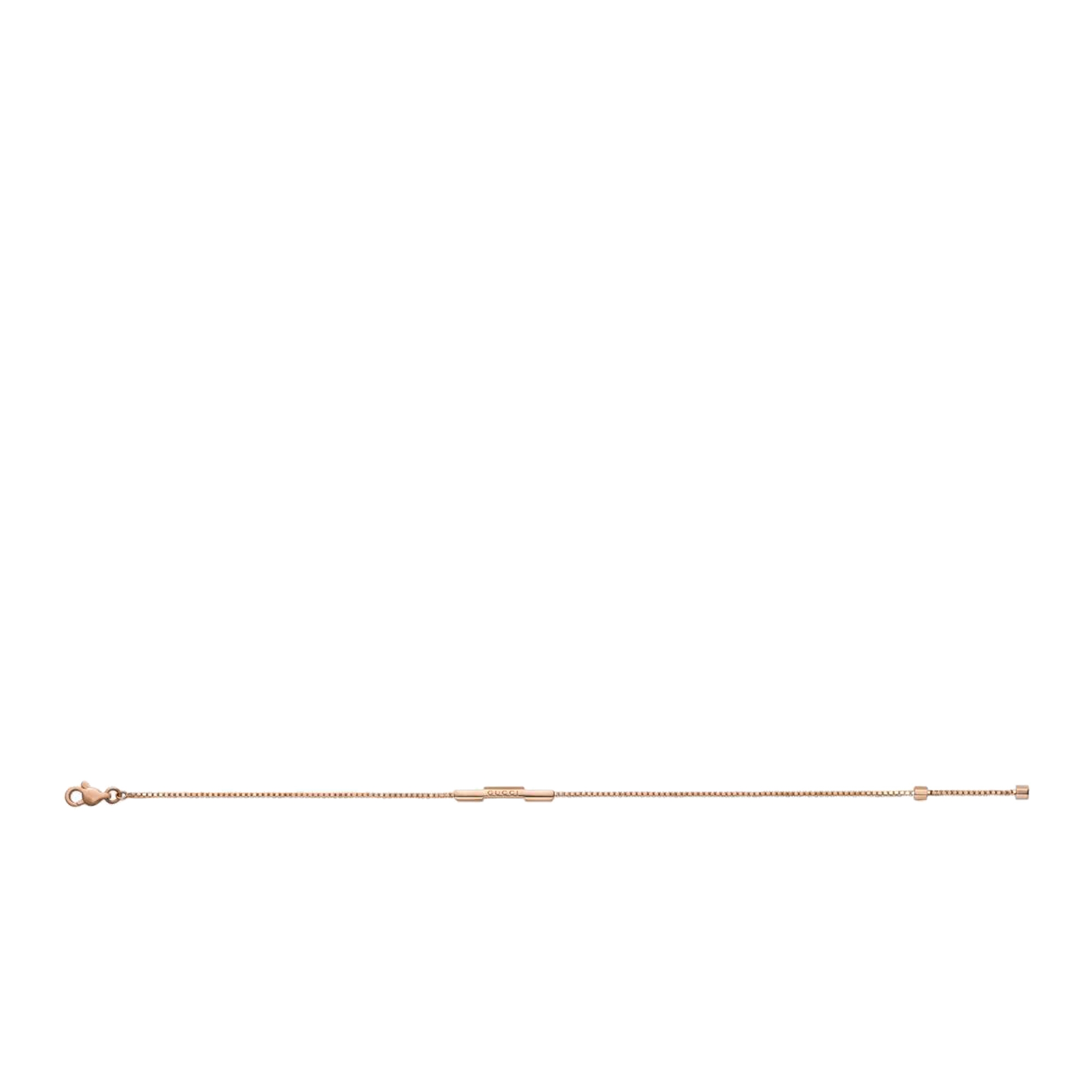 Ispirata al tema del romanticismo, la collezione Gucci Link to Love esplora i simboli dell’amore in chiave contemporanea. La collezione combina diverse tonalità di oro e un mix di finiture, sfumando i confini tra maschile e femminile. Grazie al loro design impilabile, ogni modello è creato per sperimentare nuovi modi d’indossarlo ed esprimere la propria individualità. Questo bracciale in oro rosa 18 carati ha un pendente a barretta con incisione ‘Gucci’.