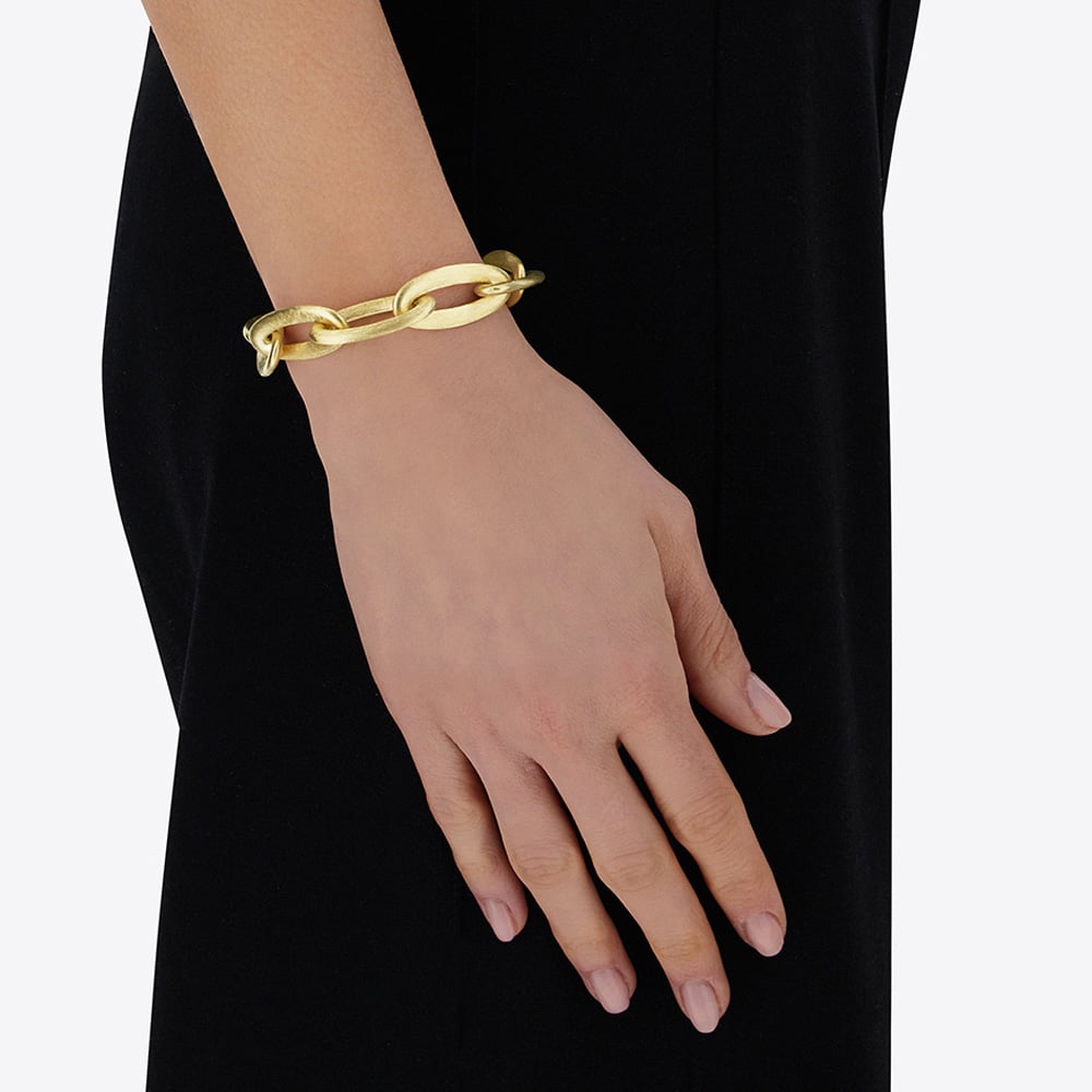 Realizzato in oro 18kt inciso a mano da artigiani, questo bracciale esprime con decisa eleganza il concetto di Nanis di catena: ovvero libera e aperta a diverse interpretazioni!