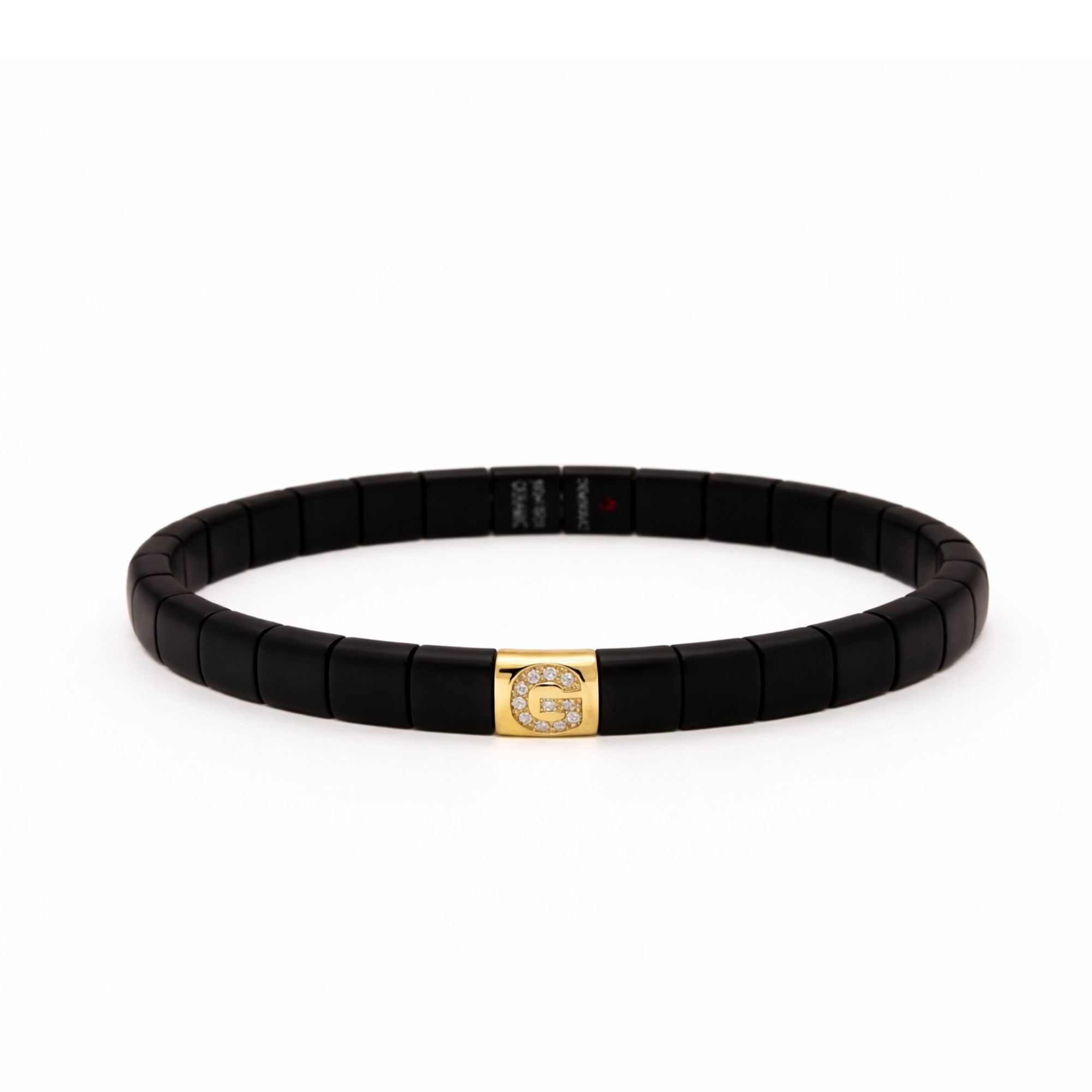 SKU: PU4NGDBOGSBracciale da donna elasticizzato in ceramica high tech nera opaca, con elemento G in oro giallo 18 ct e brillanti.