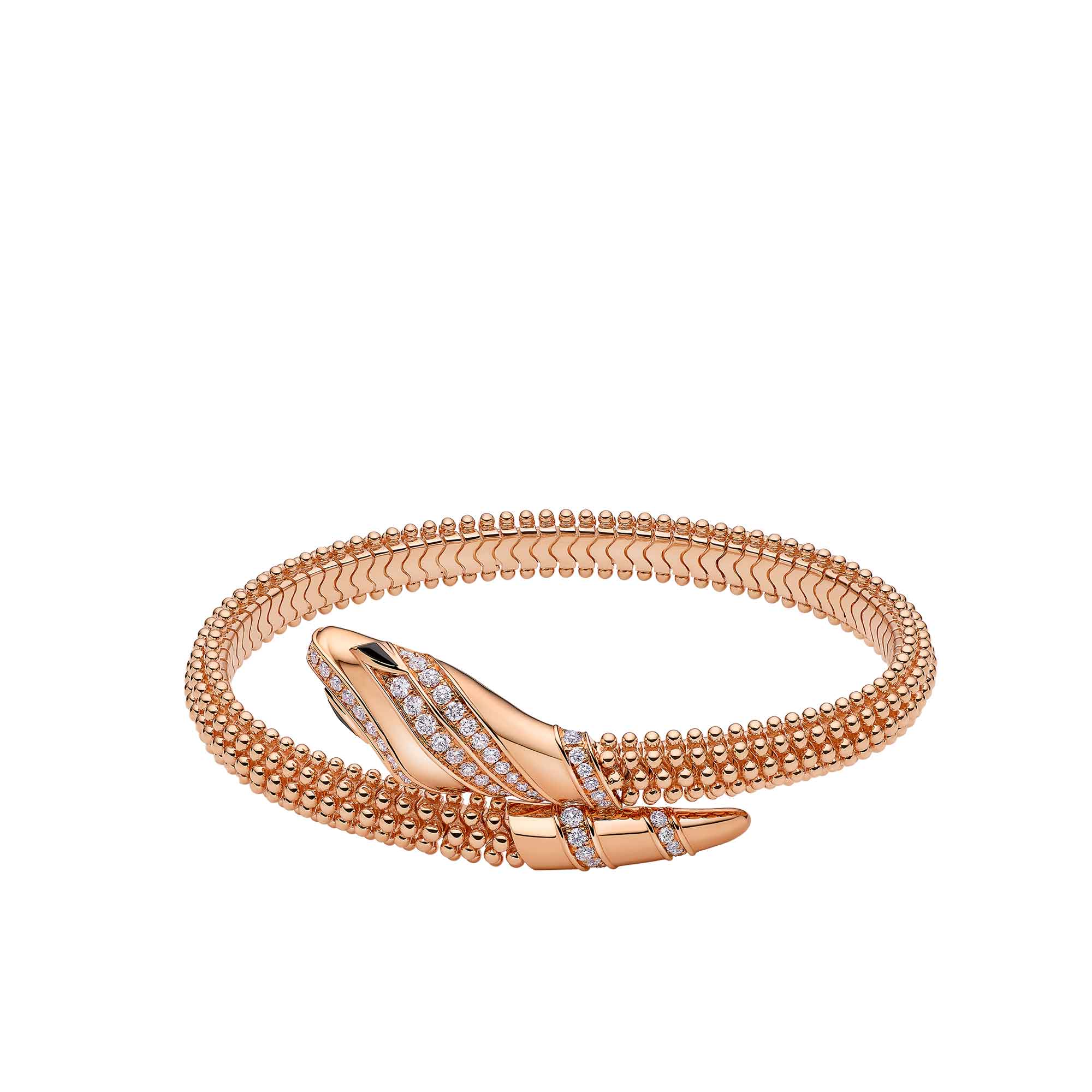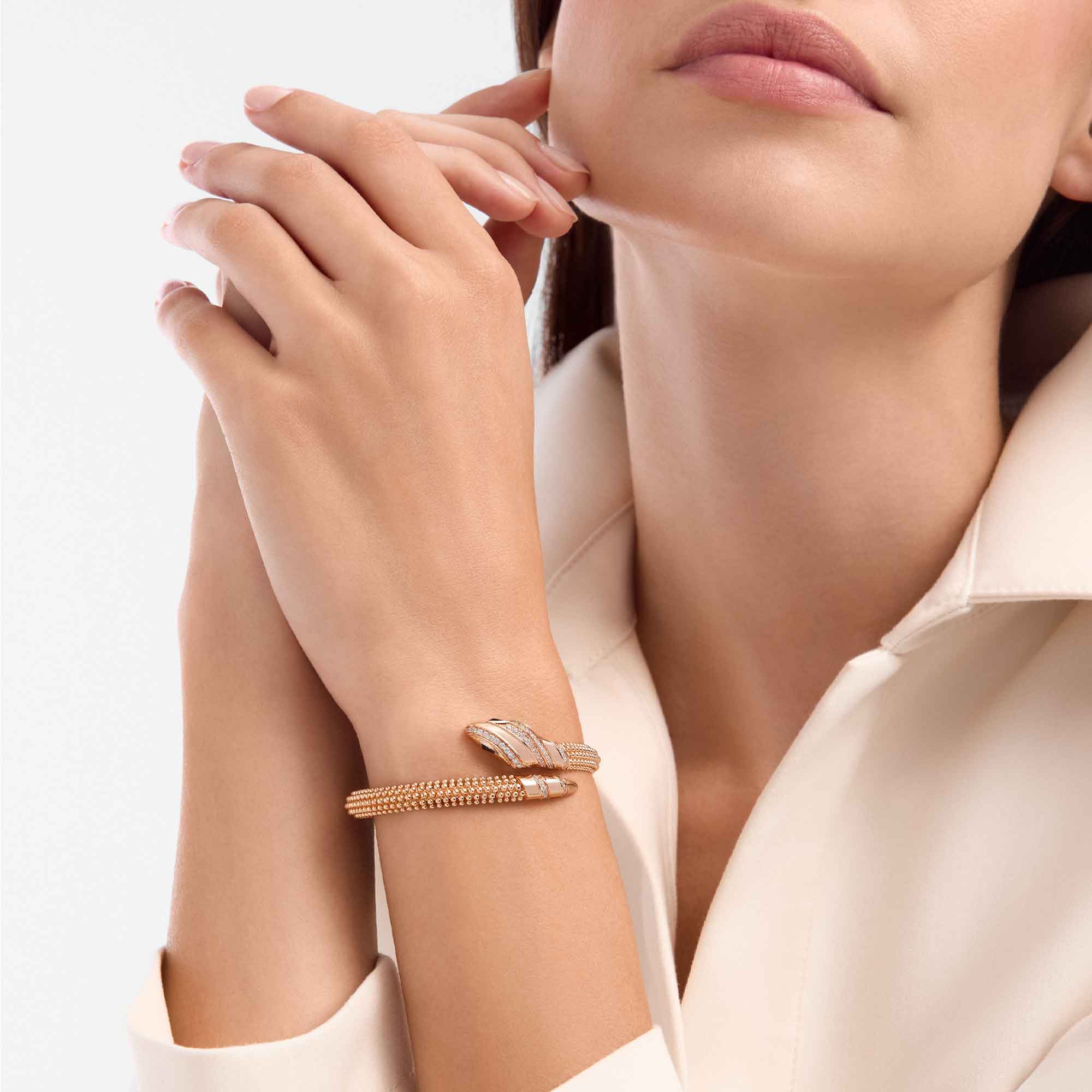 Irradiando un irresistibile magnetismo e un’eleganza dal fascino senza tempo, il bracciale Serpenti in oro rosa 18 kt è composto da piccole perle mobili in oro, che esaltano il dinamismo e le qualità tattili del gioiello, e da un’ammaliante testa e una preziosa coda illuminate da uno scintillante pavé di diamanti. Un perfetto connubio tra la più alta maestria artigianale e un comfort d’eccezione. Fonte di forza e fiducia in se stessi, Serpenti è un’icona sempre al passo con i tempi.
