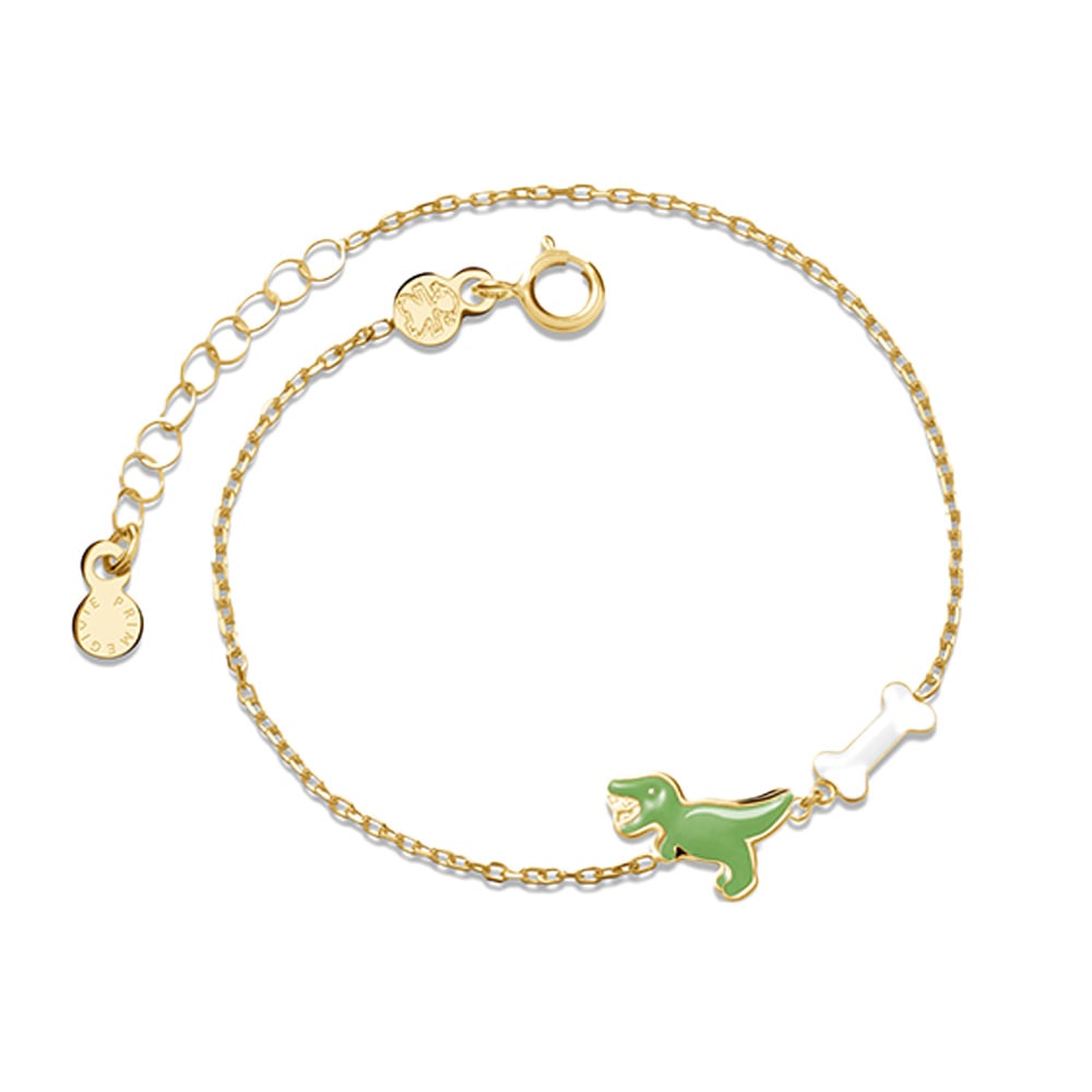 SKU: PMG071Bracciale in oro giallo con elementi a forma di dinosauro e osso con smalto colorato.