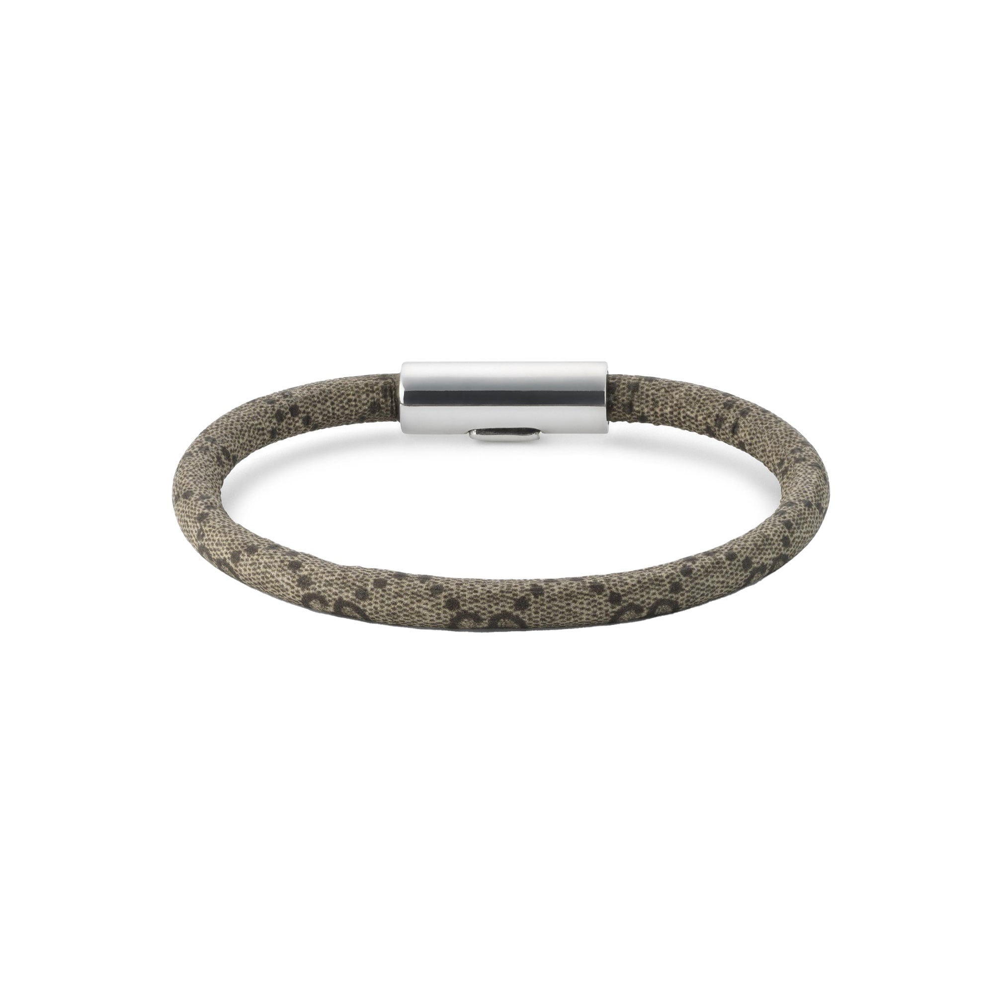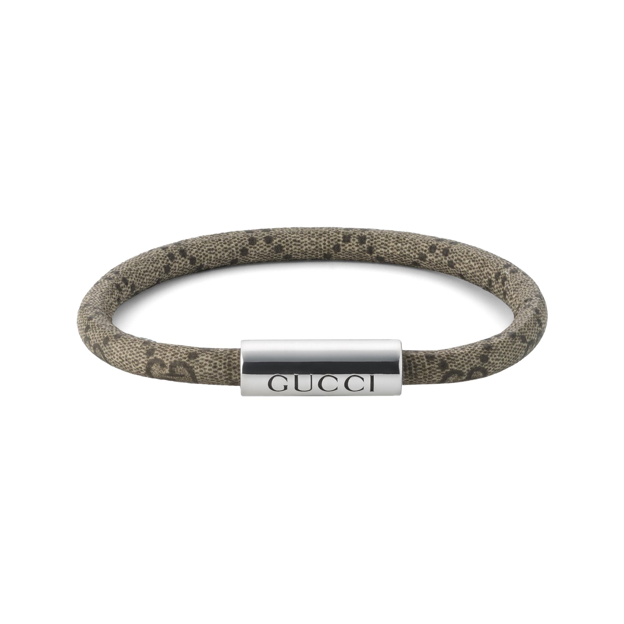 Gucci fa rivivere il suo logo trademark su targhette in argento, richiamando lo spirito moderno degli anni ’90. I bracciali proposti in tessuto GG Supreme beige ed ebano offrono un’alternativa alla linea di gioielli da indossare tutti i giorni.