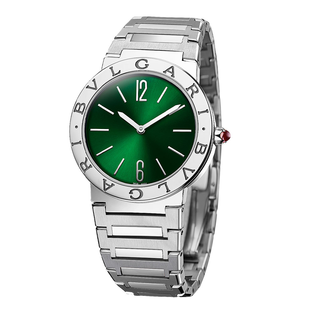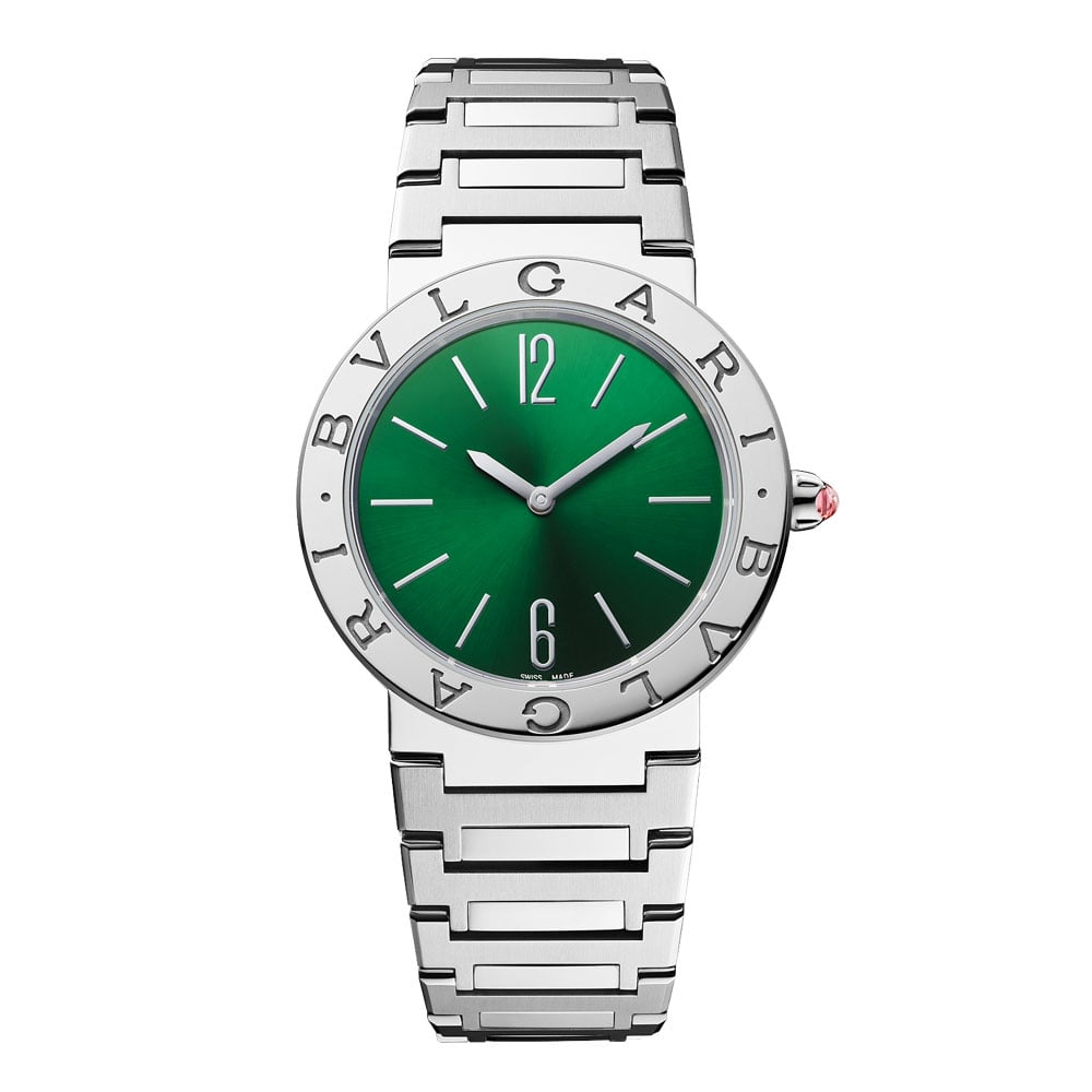Orologio BVLGARI BVLGARI LADY con movimento al quarzo, cassa di 33 mm in acciaio inossidabile, lunetta in acciaio inossidabile con logo, corona in acciaio inossidabile con rubellite sintetica taglio cabochon, quadrante verde con finiture spazzolate soleil, finestrella della data e bracciale in acciaio inossidabile.