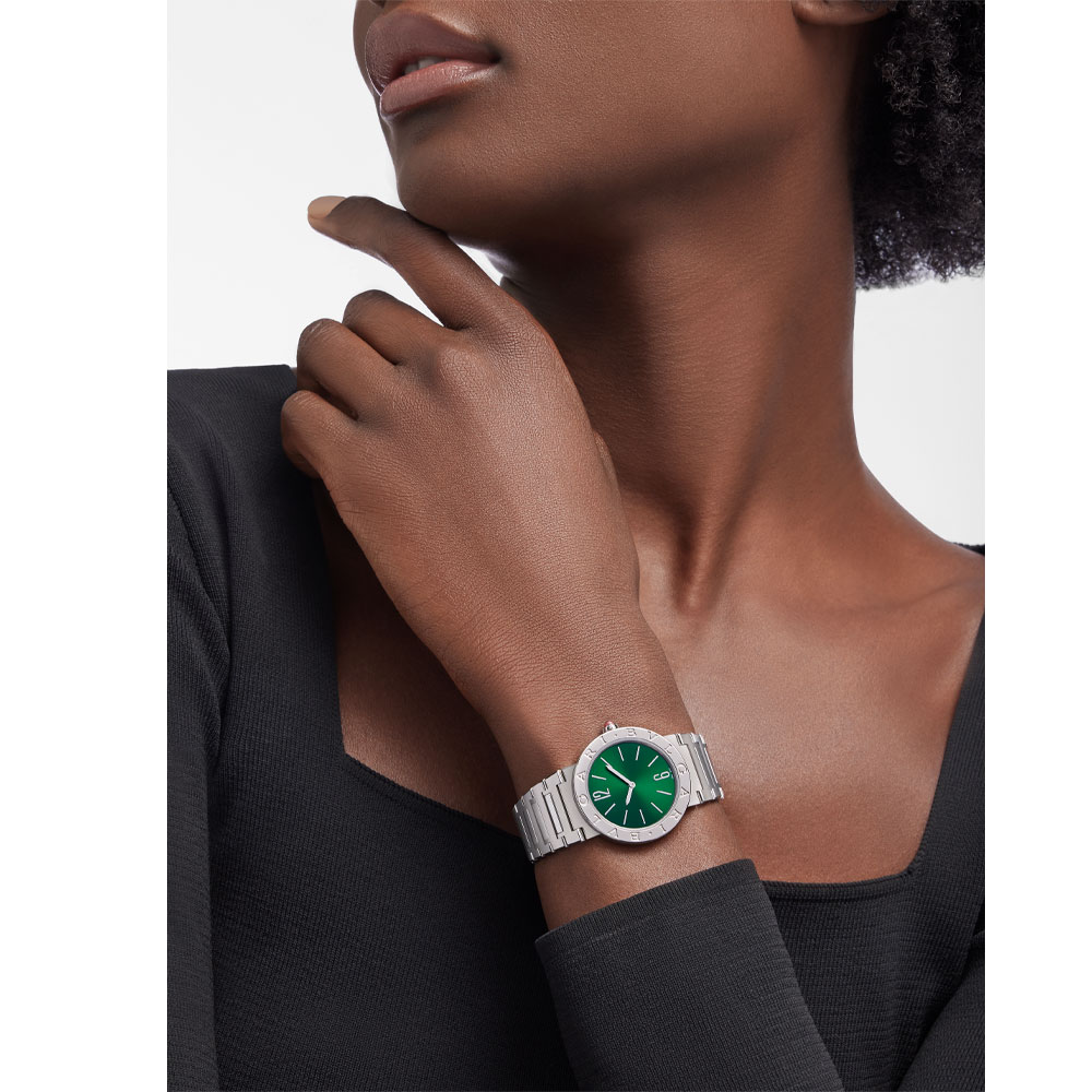 SKU: 103693Orologio BVLGARI BVLGARI LADY con cassa in acciaio inossidabile, bracciale in acciaio inossidabile, lunetta in acciaio inossidabile con doppio logo e quadrante verde con finiture spazzolate soleil.