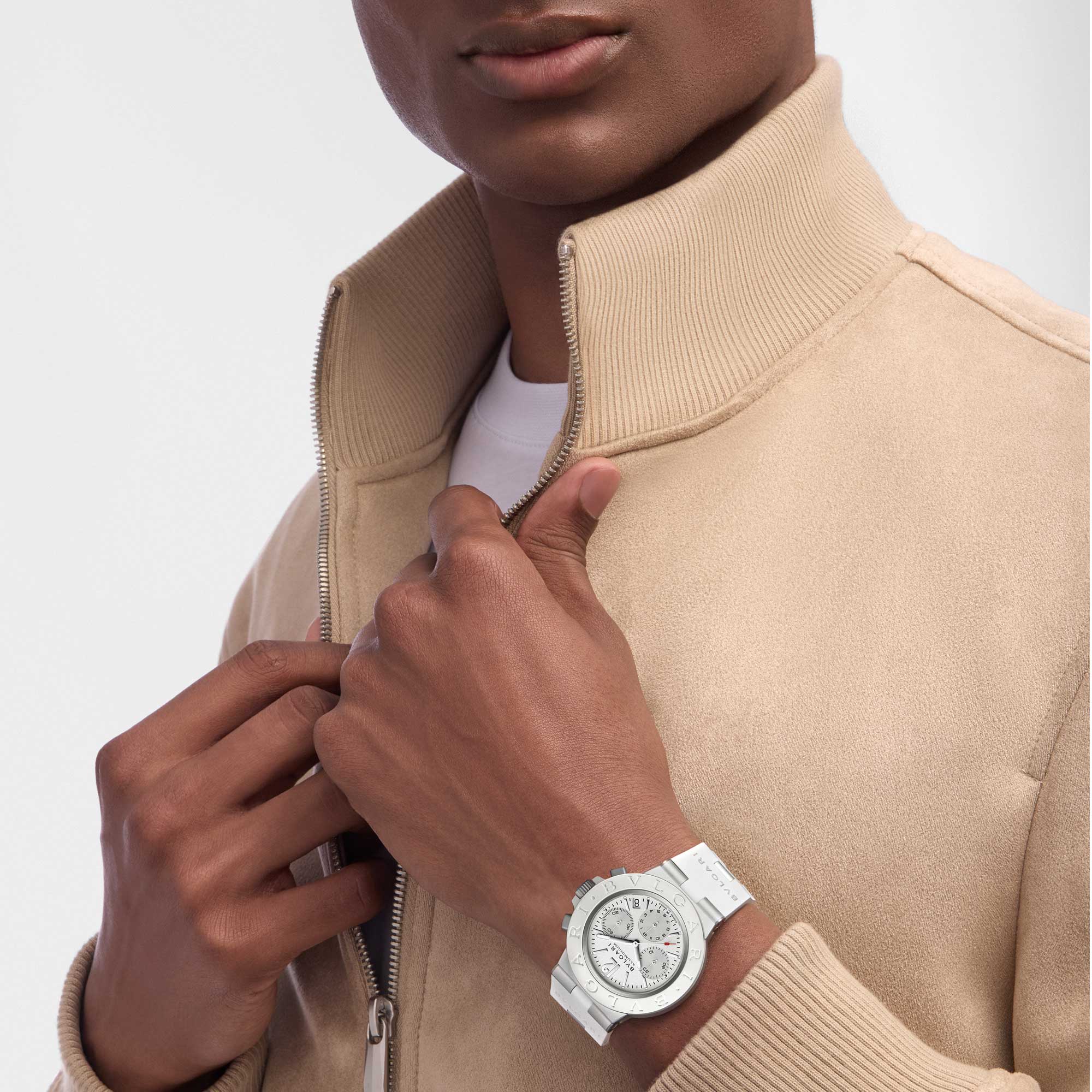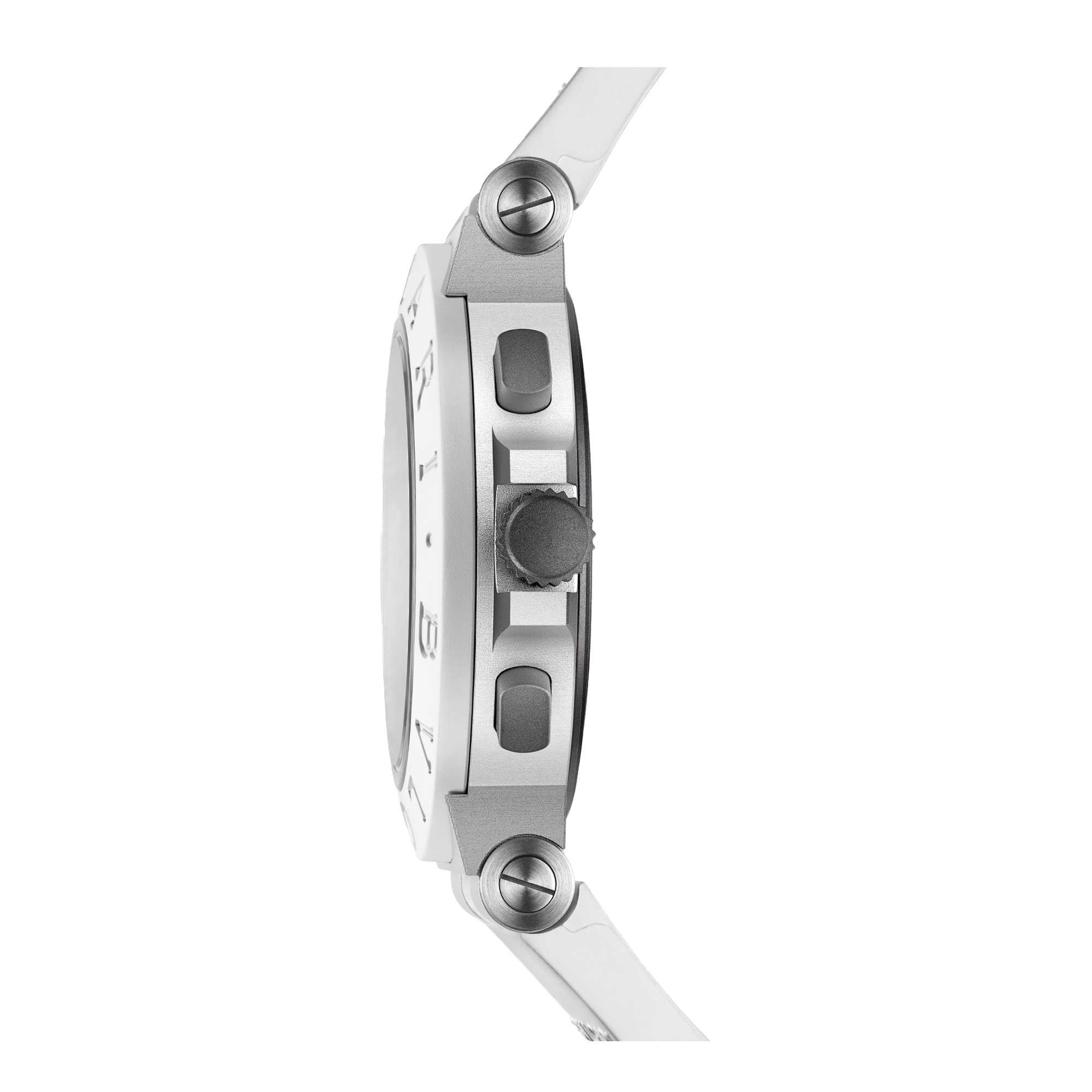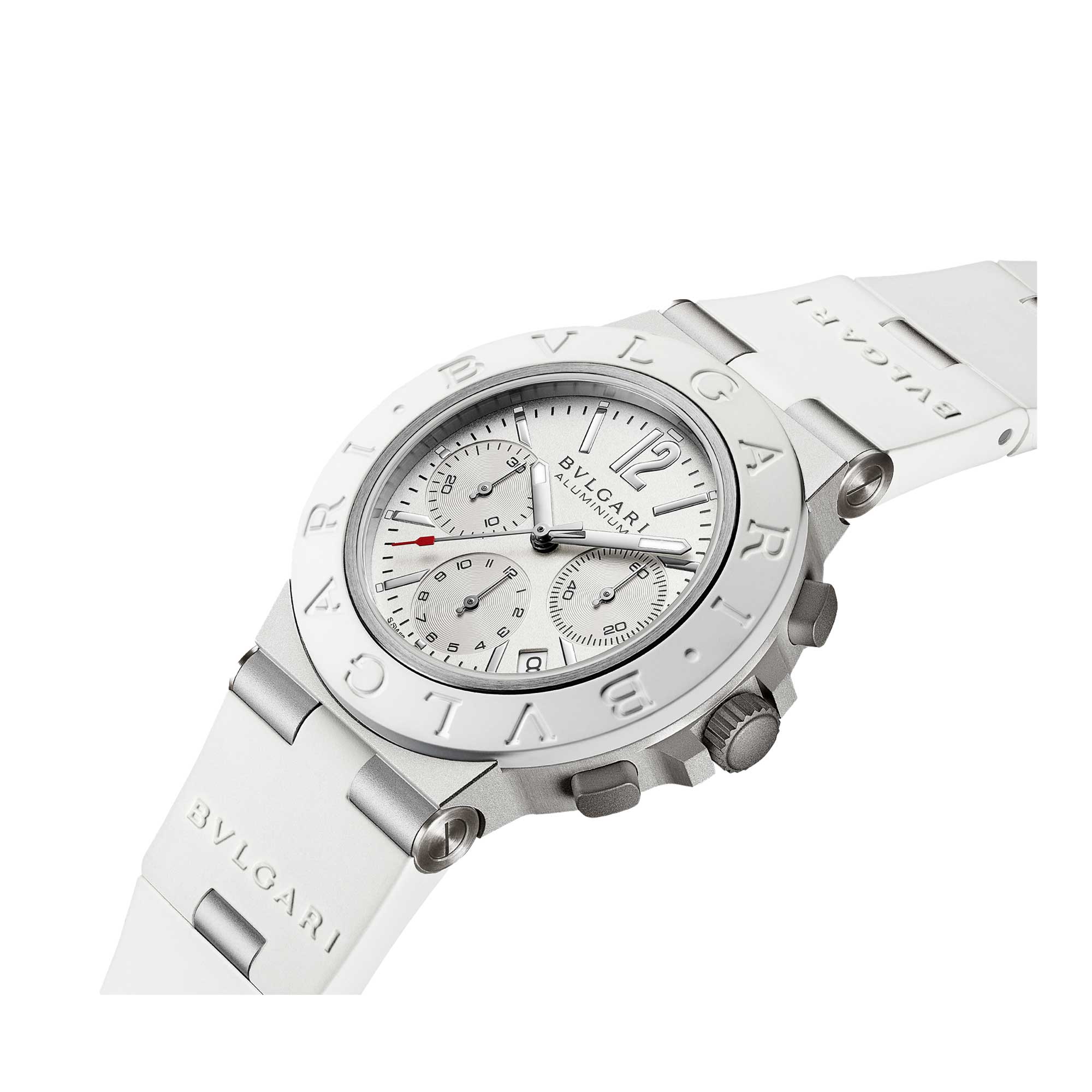 Cassa di 40 mm in alluminio sabbiato, lunetta in caucciù bianco con logo BVLGARI BVLGARI, quadrante verniciato bianco con contatori cronografici azuré, finestrella della data a ore 4/5, indici rodiati, lancette ore e minuti in ottone rodiato lucido con Super-LumiNova®, lancetta cronografo secondi centrali in ottone rodiato lucido con punta laccata rossa, lancette contatori cronografici in ottone rodiato lucido, corona e pulsanti in titanio sabbiato, fondello in titanio sabbiato con finiture satinate e cinturino in caucciù bianco con anse e fibbia ad ardiglione in alluminio sabbiato. Impermeabile fino a 100 metri.