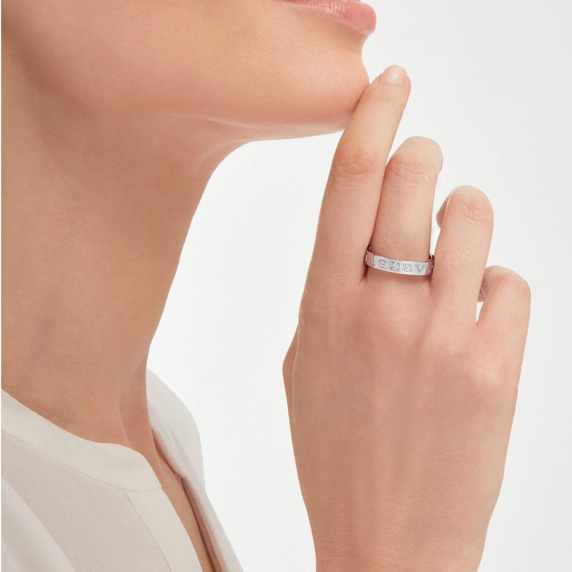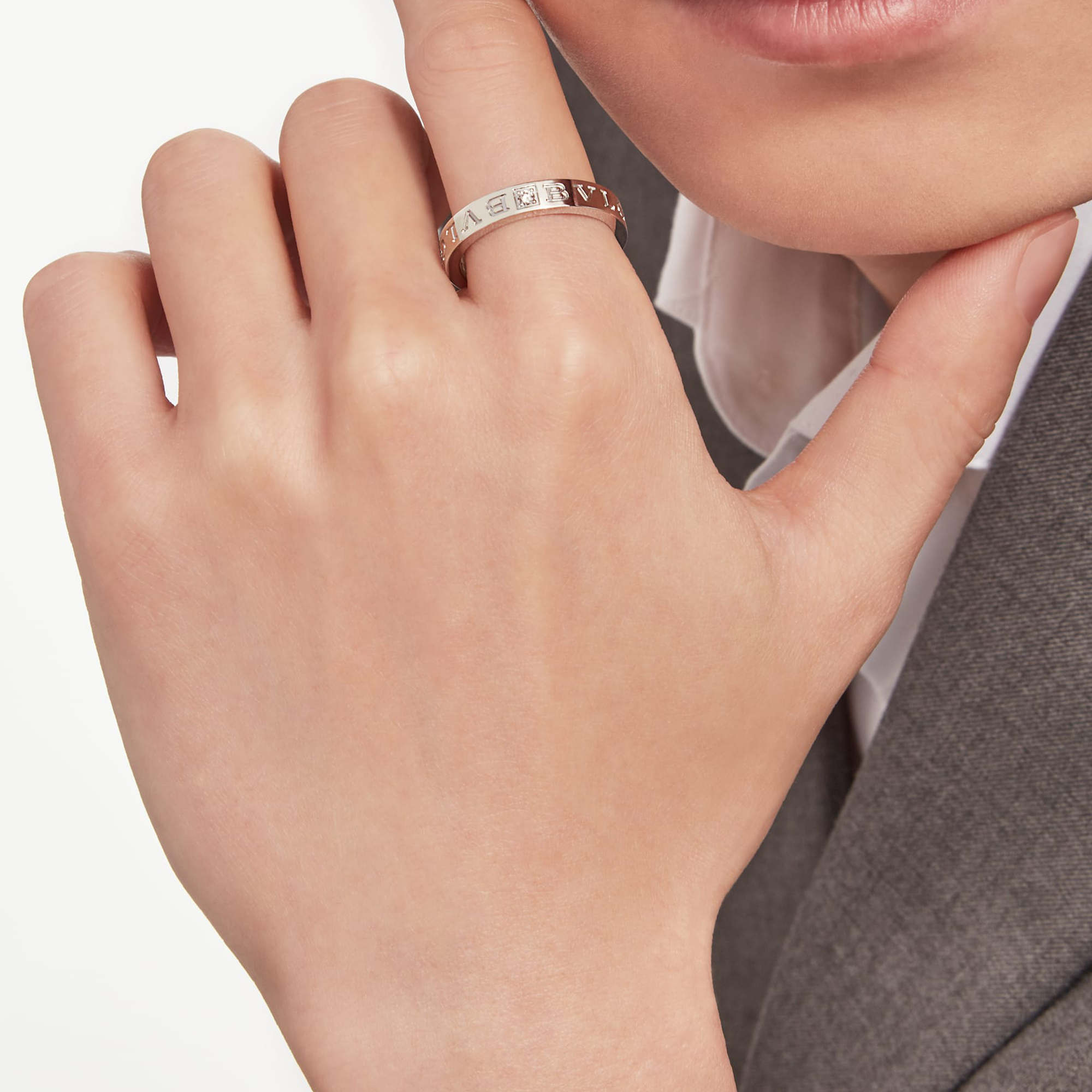 Rievocando le origini romane della Maison, l’anello BVLGARI BVLGARI dà vita a un sofisticato connubio tra tradizione e modernità. Ispirato alle iscrizioni incise lungo il bordo delle antiche monete romane, l’iconico doppio logo si rivela in nuove accattivanti rivisitazioni dall’eleganza contemporanea, divenendo un elemento distintivo del design Bvlgari. In linea con lo spirito dinamico che anima la collezione, il gioiello può essere abbinato ad altri anelli in una varietà di eclettiche combinazioni. Anello BVLGARI BVLGARI in oro bianco 18 kt con diamante.