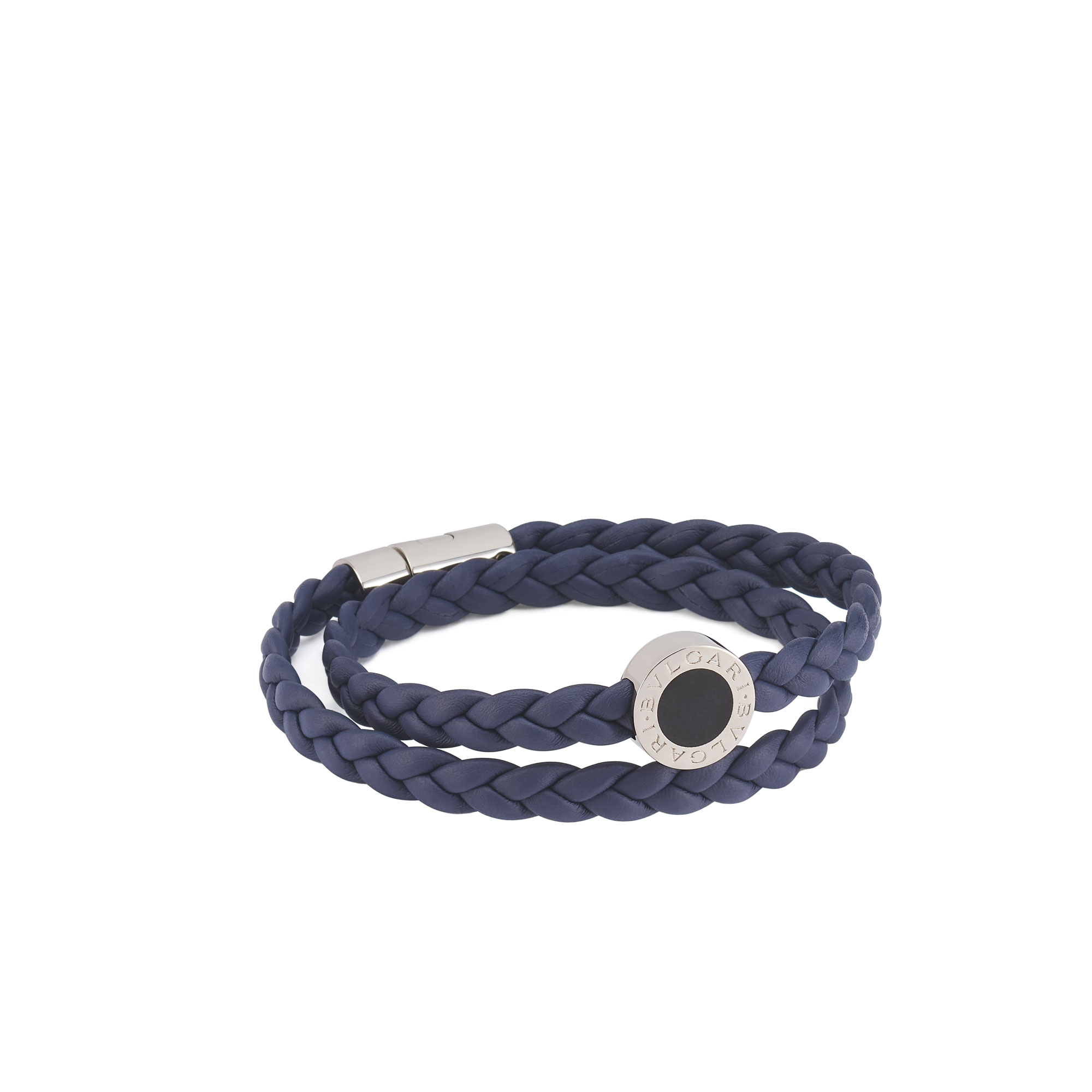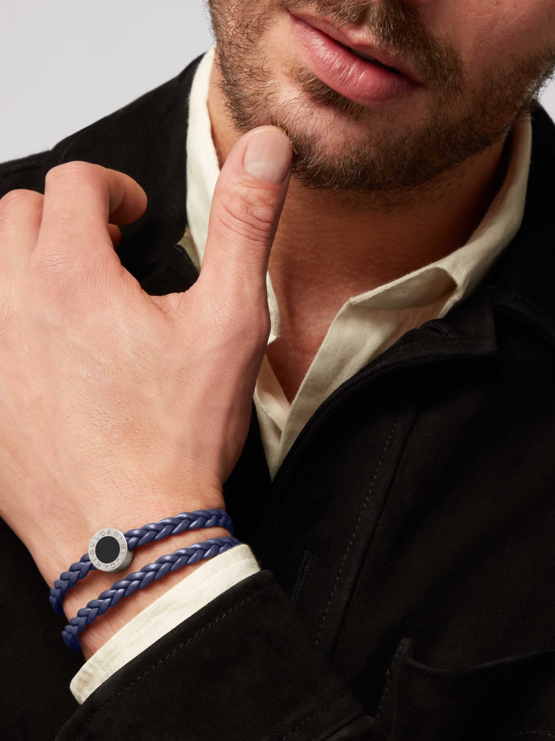 Bracciale Bvlgari Bvlgari Man in vitello intrecciato blu Poseidon laspislazzuli. Dando un tocco di eleganza allo stile di ogni giorno, il modello presenta l’iconico motivo della collezione con inserto in smalto opaco nero e doppio logo. Chiusura a scatto. Una creazione interamente realizzata in Italia. 17,5 cm (circonferenza polso).