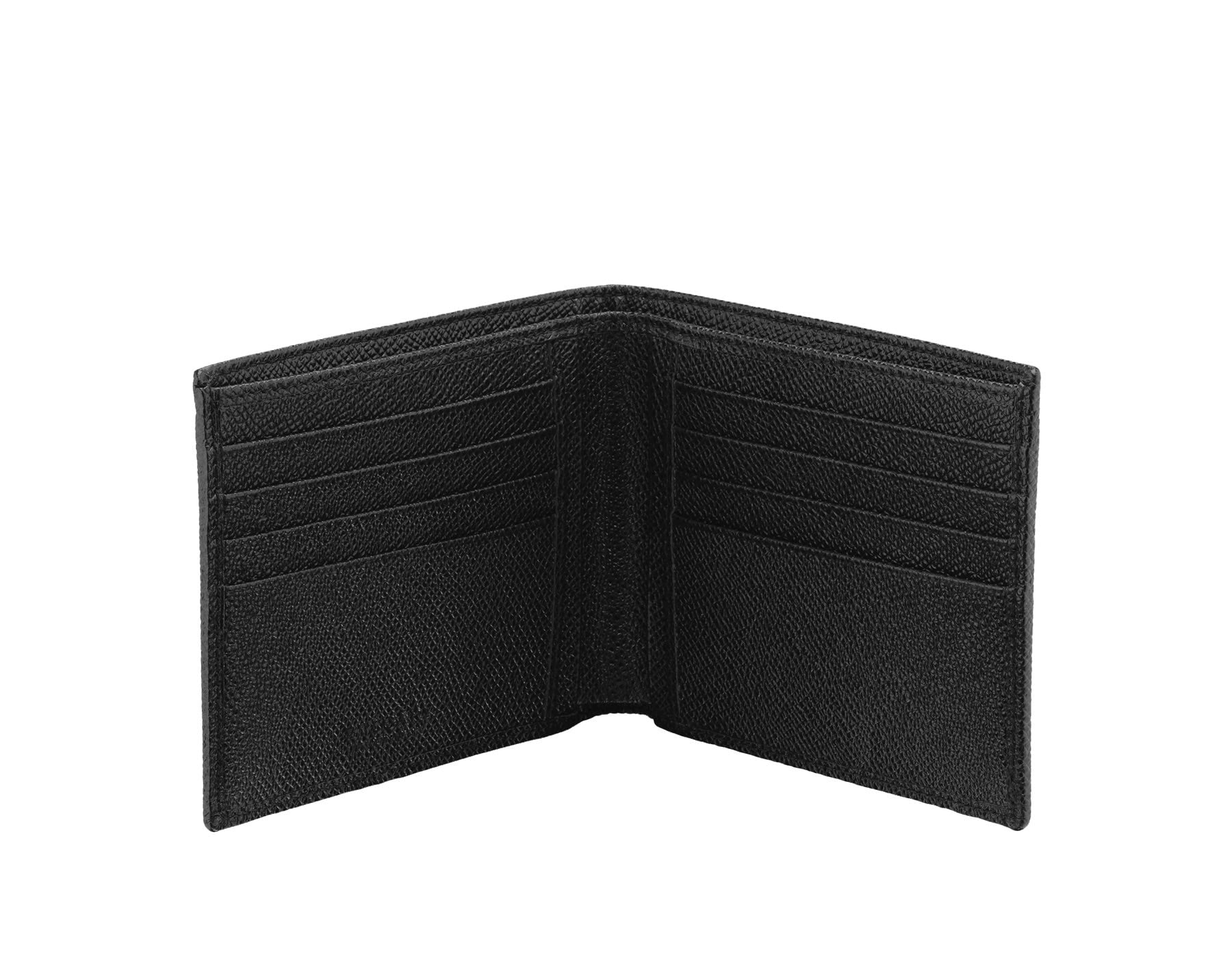 Portafoglio uomo in vitello martellato nero con finiture in ottone placcato palladio. Otto scomparti per carte di credito, due scomparti per banconote e quattro scomparti interni. Disponibile anche in altri colori. 12 x 10 cm