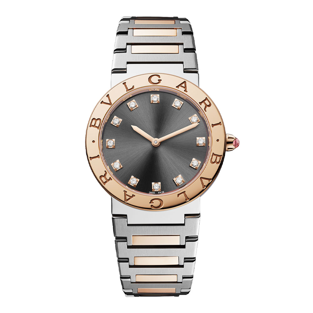 Simbolo della capacità di Bvlgari di reinventare, da oltre 40 anni, i classici del passato attraverso creazioni dal fascino pionieristico, l’orologio BVLGARI BVLGARI è stato il primo a utilizzare il logo come elemento di design. Anticipando l’attuale logomania, l’iconico doppio logo circolare – ispirato alle iscrizioni incise lungo il bordo delle monete antiche – rievoca le origini romane della Maison per dar vita a un perfetto connubio tra tradizione e modernità, eleganza e stile quotidiano. Orologio BVLGARI BVLGARI LADY con movimento al quarzo, cassa di 33 mm in acciaio inossidabile, lunetta in oro rosa 18 kt con logo, corona in oro rosa 18 kt con pietra rosa taglio cabochon, quadrante laccato grigio, indici con diamanti e bracciale in acciaio inossidabile e oro rosa 18 kt.