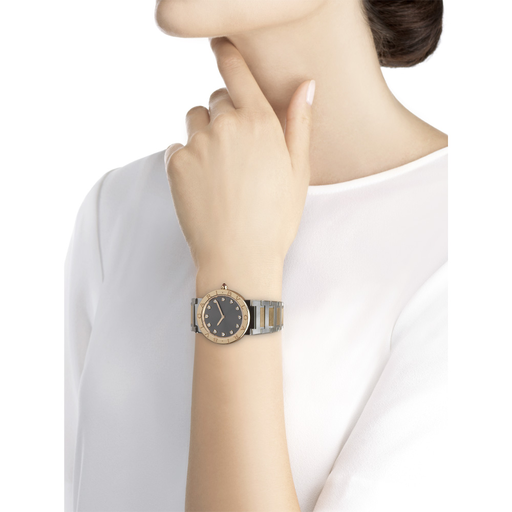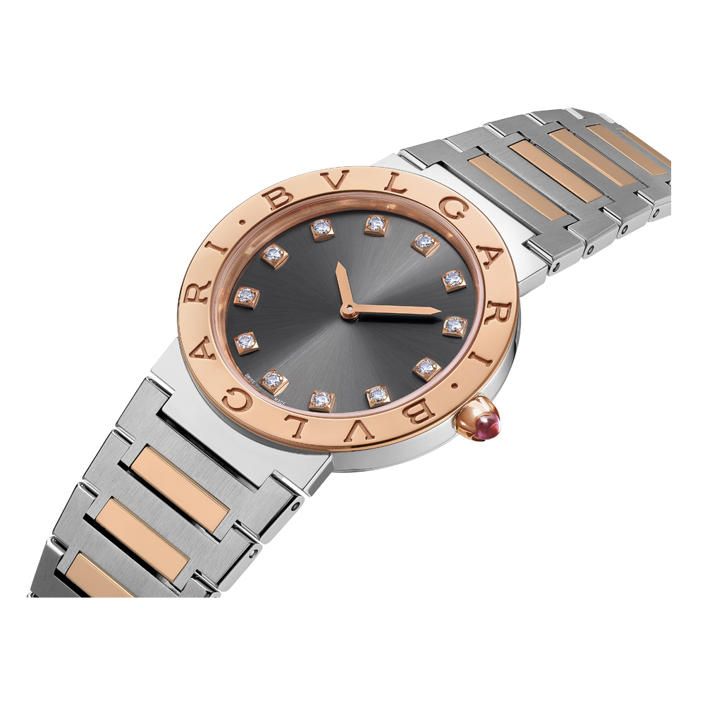 Orologio Bvlgari Bvlgari lady con cassa in acciaio inossidabile, lunetta in oro rosa 18 kt con doppio logo, quadrante laccato grigio, indici con diamanti e bracciale in acciaio inossidabile e oro rosa 18 kt.