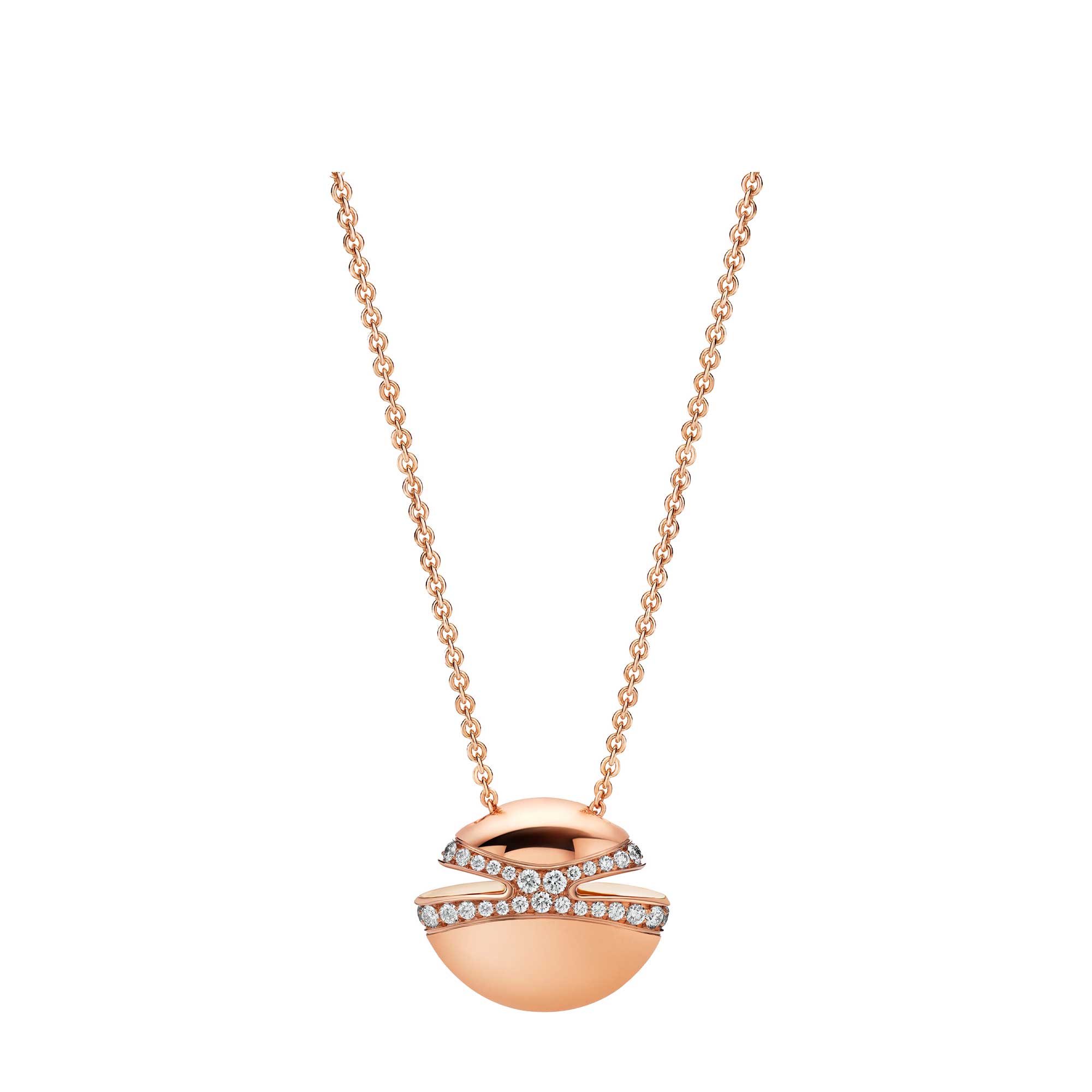 Nata dalla composizione simmetrica di due cabochon, che si uniscono in una perfetta armonia di forme e volumi, la collana Bvlgari Cabochon in oro rosa 18 kt è un talismano d’amore e di buona fortuna. Un simbolo prezioso che porta con sé una promessa d’amore eterno o un semplice augurio di felicità. Ispirandosi alle superfici levigate del taglio cabochon – un taglio che esalta il fascino naturale delle gemme, emblema dello stile Bvlgari sin dagli Cinquanta – il gioiello sublima lo splendore dell’oro e ne rivela l’assoluta purezza. A dare un tocco di preziosa eleganza alla creazione, un raffinato pavé di diamanti.