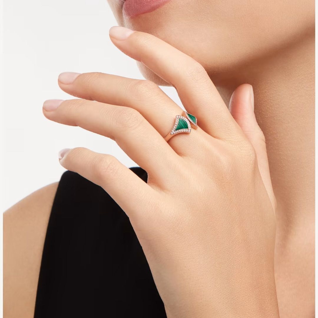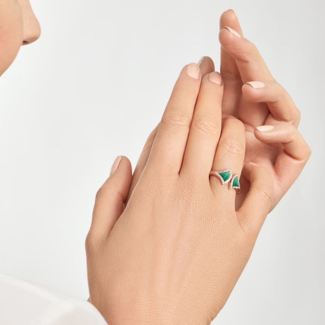 Emblema di raffinatezza e glamour italiano, l’anello DIVAS’ DREAM in oro rosa 18 kt rende omaggio alle dive più affascinanti attraverso lo splendore dello stile romano. Ispirato all’eleganza femminile, il motivo a ventaglio che adorna il gioiello è impreziosito da inserti in malachite contornati da un radioso pavé di diamanti. Un design dallo stile inconfondibile, che evoca le seducenti geometrie degli antichi mosaici romani delle Terme di Caracalla, in un tributo all’eterna bellezza.