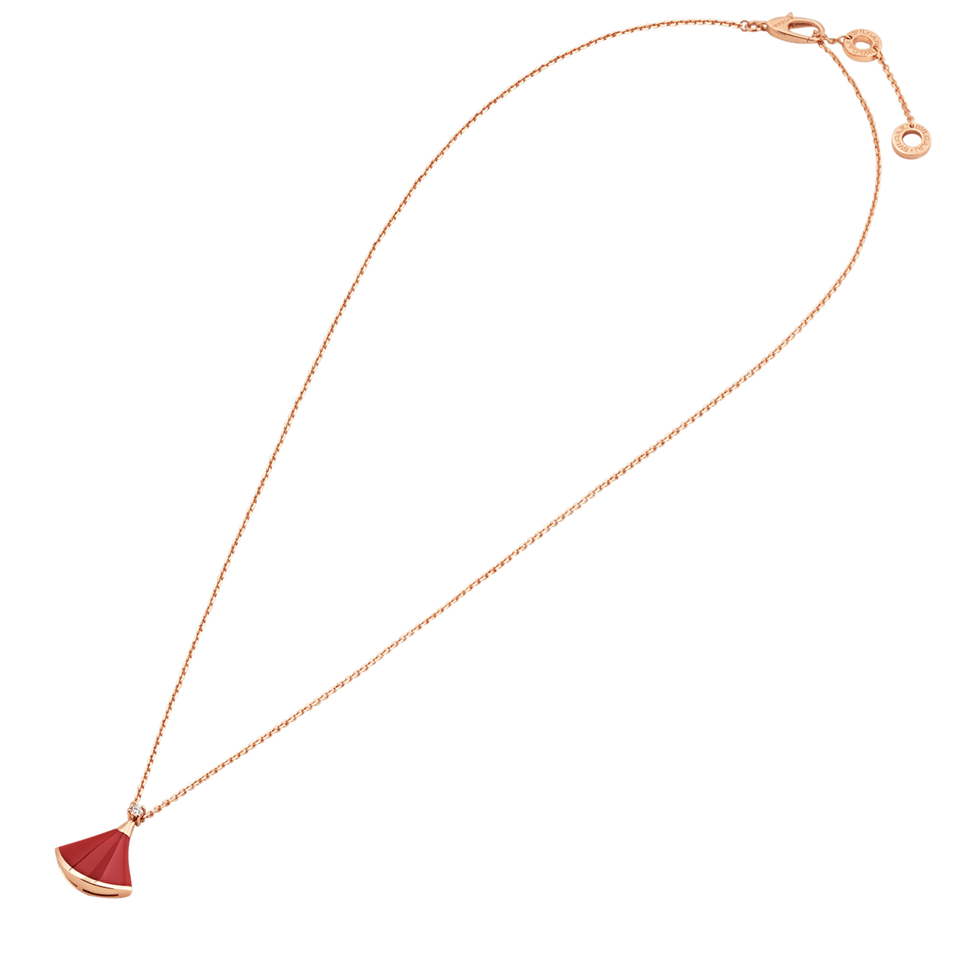 Catturando lo splendore della Città Eterna, la collana DIVAS’ DREAM rende omaggio all’eleganza e al fascino delle dive contemporanee. Con il suo esclusivo design ispirato ai marmi policromi e ai magnifici mosaici a ventaglio delle Terme di Caracalla, la collana incarna la quintessenza della femminilità e della bellezza italiana. Collana DIVAS’ DREAM in oro rosa 18 kt con corniola e diamante. Lunghezza 41-43 cm.