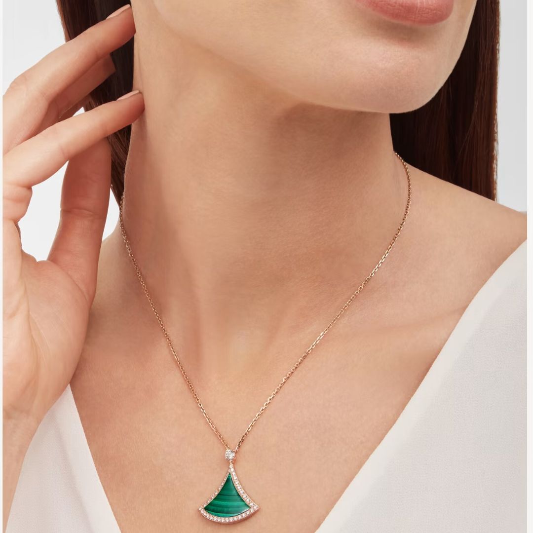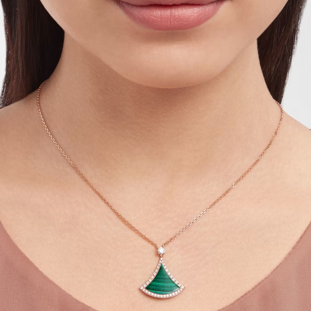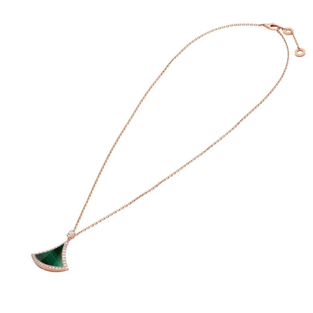 Un design dallo stile inconfondibile che evoca le seducenti geometrie degli antichi mosaici romani delle Terme di Caracalla, incarnando la quintessenza della bellezza italiana, la collana con pendente DIVAS’ DREAM in oro rosa 18 kt rende omaggio allo splendore della Città Eterna e al fascino delle dive contemporanee. Ispirato all’eleganza femminile, il raffinato motivo a ventaglio che adorna il gioiello è impreziosito da un inserto in malachite contornato da un radioso pavé di diamanti.
