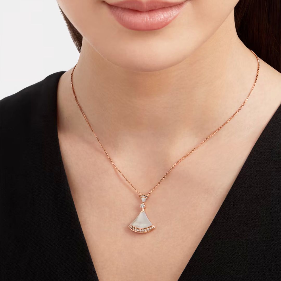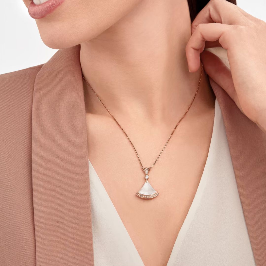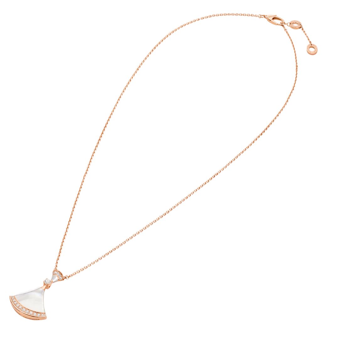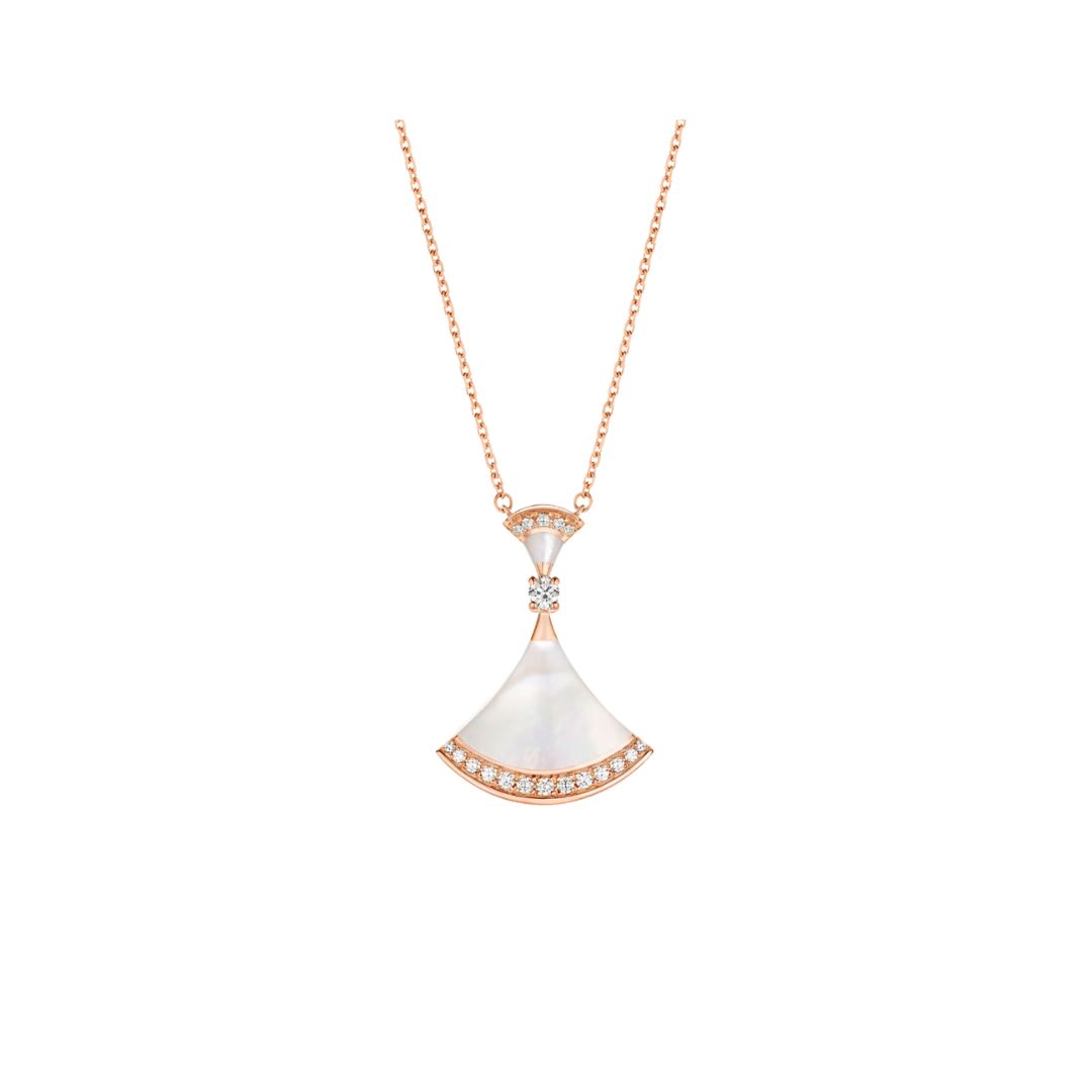 Emblema di stile ed eleganza italiana, la collana DIVAS’ DREAM evoca il mito della Diva e il suo fascino misterioso e accattivante. Con il suo iconico motivo a ventaglio, ispirato ai magnifici mosaici romani delle Terme di Caracalla, il pendente incarna la quintessenza della femminilità e della bellezza italiana, celebrando l’indissolubile legame tra Bvlgari e la Città Eterna. Una creazione dal design contemporaneo, impreziosita da una sofisticata composizione di gemme. Collana DIVAS’ DREAM in oro rosa 18 kt con inserti in madreperla, diamante tondo taglio brillante e pavé di diamanti.