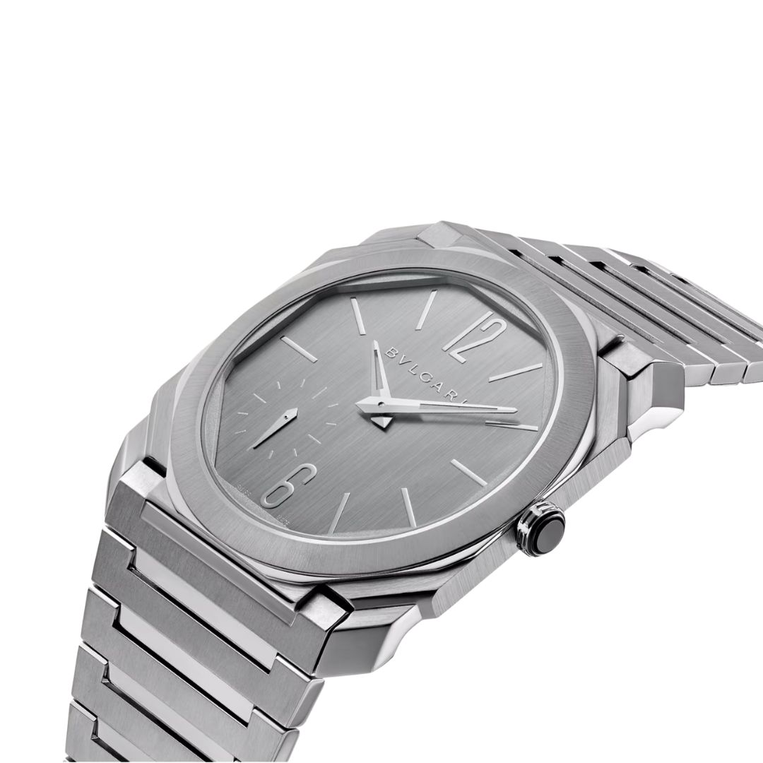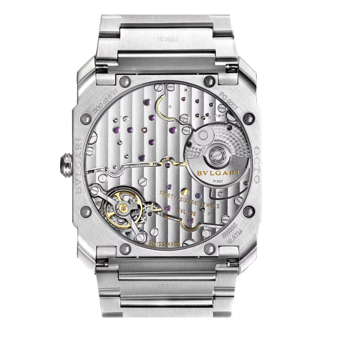 Orologio Octo Finissimo S con movimento meccanico di manifattura a carica automatica, microrotore in platino, indicazione di ore, minuti e piccoli secondi, calibro BVL 138 Finissimo (spessore 2,23 mm) con finiture Côtes de Genève, ponti con finiture anglage, platina con finiture perlage, riserva di carica di 60 ore, frequenza 21.600 VpH. Cassa ultrasottile di 40 mm in acciaio inossidabile lucido-satinato (spessore 6,40 mm), fondello a vista, corona a vite in acciaio inossidabile lucido con inserto in ceramica, quadrante argento con finiture spazzolate verticali, bracciale in acciaio inossidabile con finiture spazzolate verticali, elementi lucidi e fibbia déployante. Impermeabile fino a 100 metri.