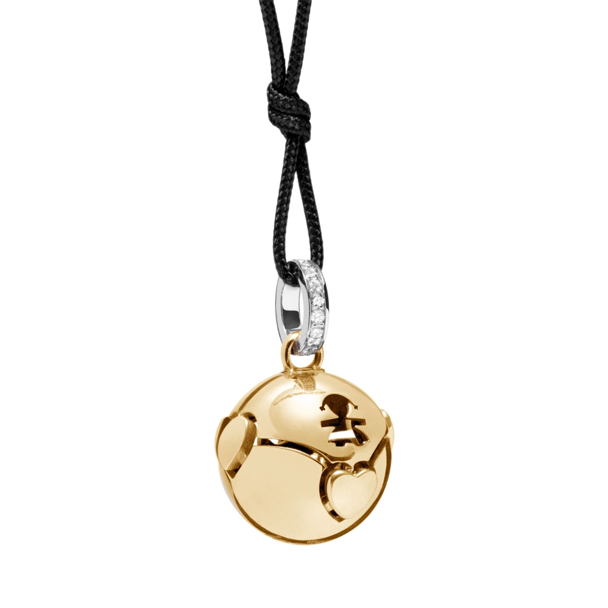 lIl compagno prezioso per la tua dolce attesa, il ricordo più bello da rivivere sempre. Ciondolo in oro giallo con sagome traforate e decorazione a cuoricini in altorilievo, contromaglia in oro bianco con diamanti e cordino ecologico nero da 110cm.