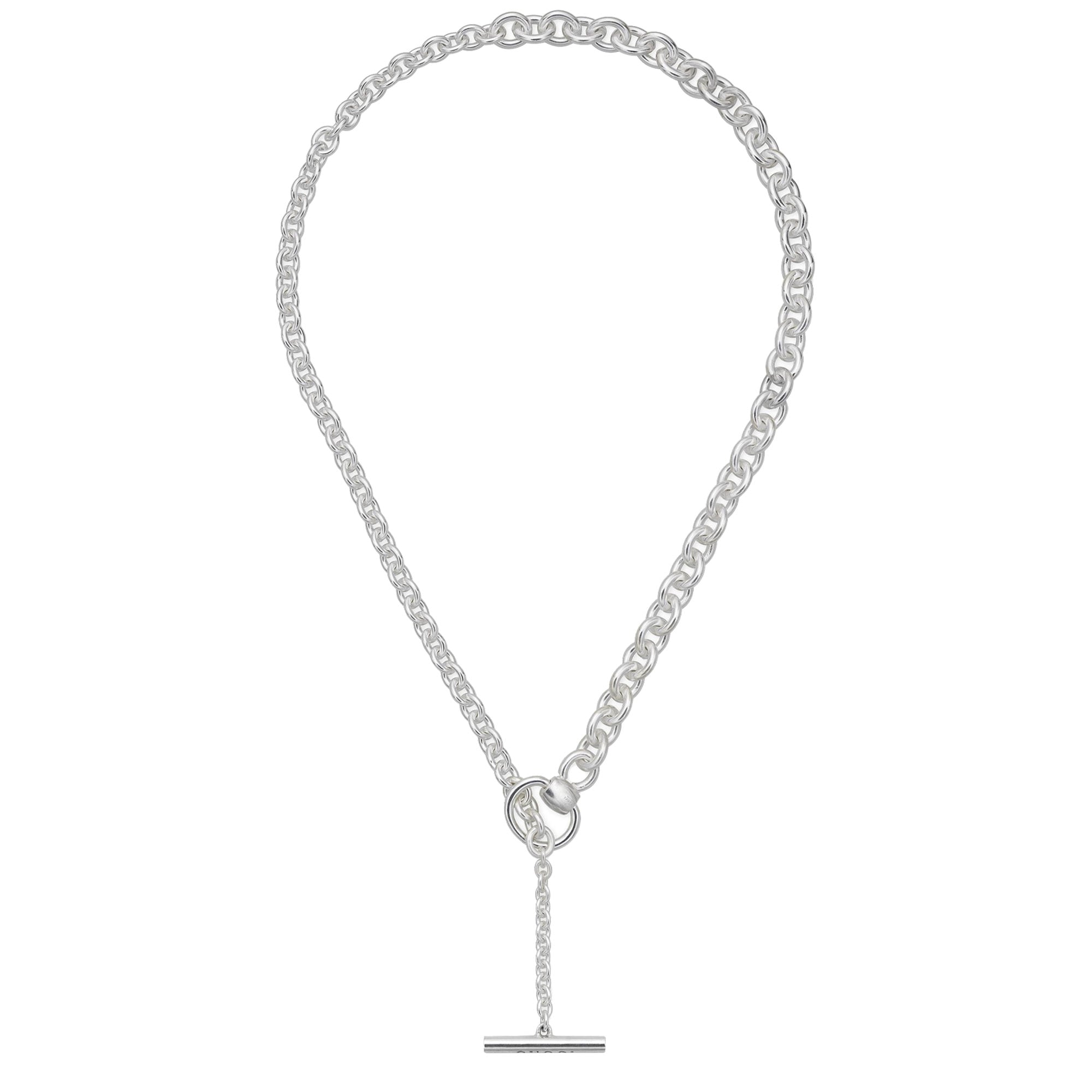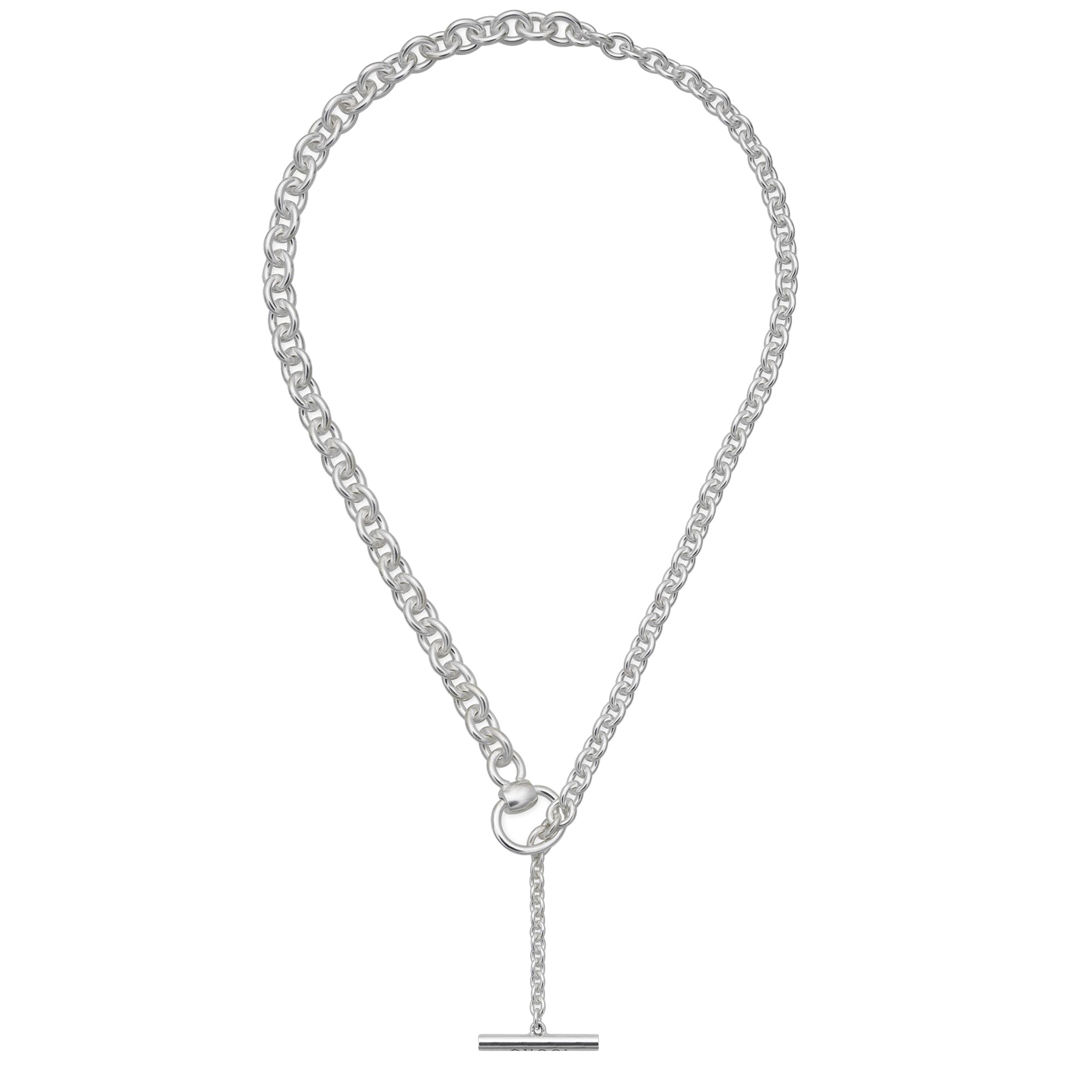 Il motivo ispirato alla cultura equestre conferisce il suo fascino a diverse silhouette. Il design a doppio anello e barra caratterizza una selezione di eleganti orecchini, bracciali, tra cui uno rigido, e una collana lunga. Questa collana lunga a catena presenta una chiusura a barra con incisione Gucci che funge anche da pendente.