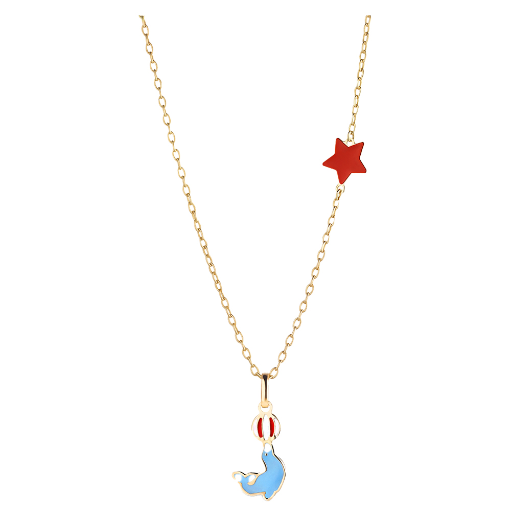 Collana in oro giallo con ciondolo smaltato a forma di foca e elemento a forma di stellina smaltato.