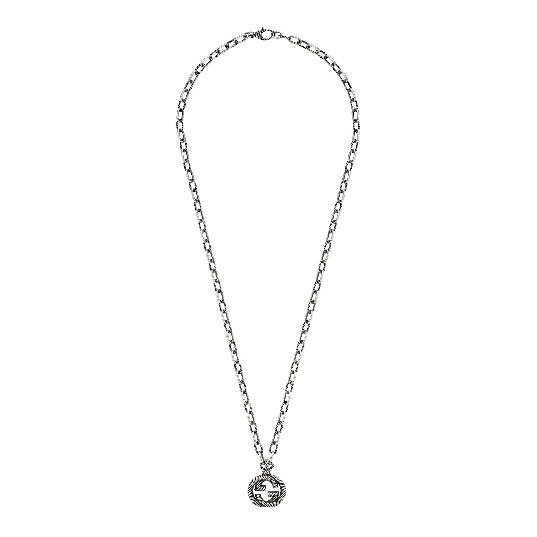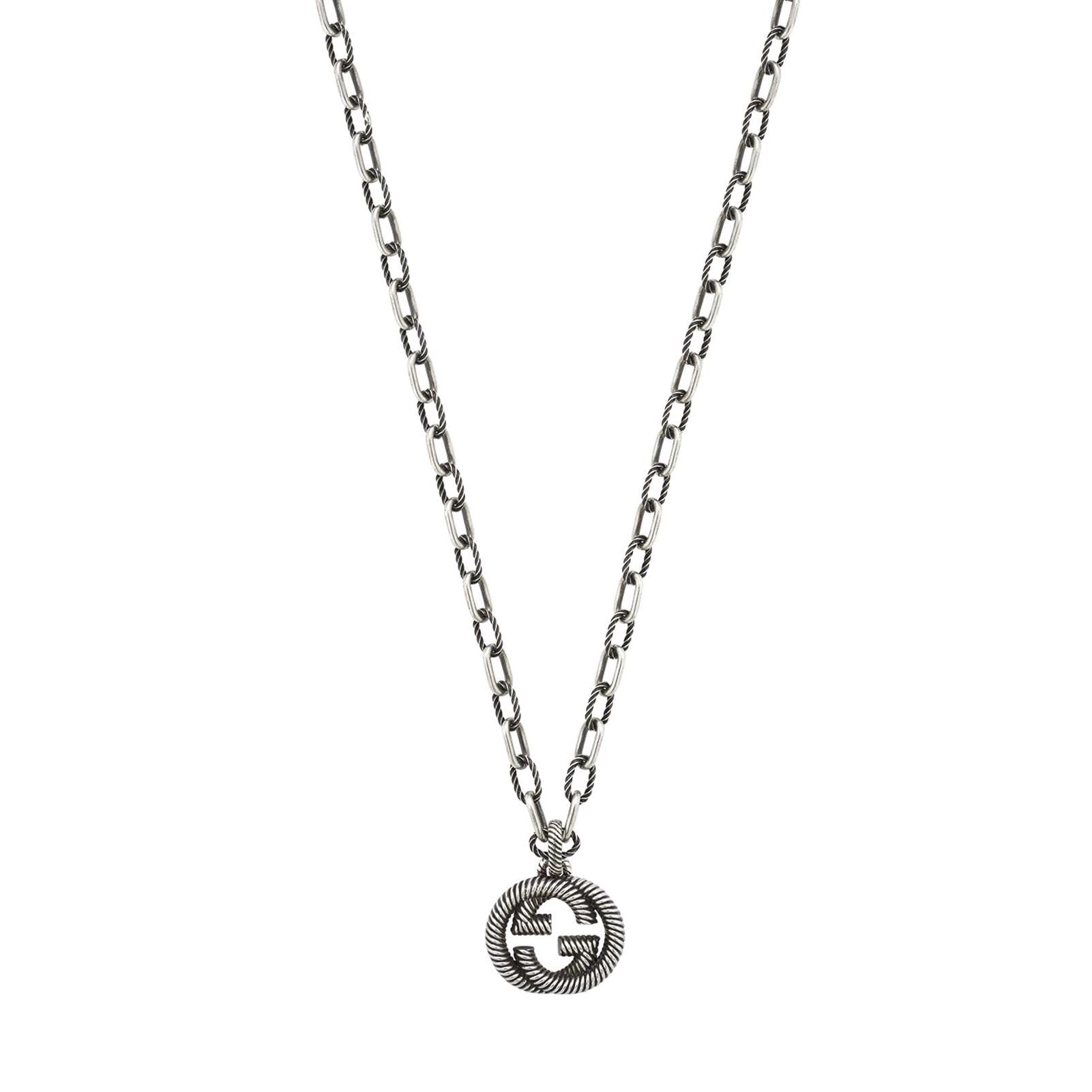 Anelli lisci e lavorati si alternano nella catena che forma questa collana in argento 925, per un risultato contemporaneo. Un pendente inciso con logo GG completa il gioiello.