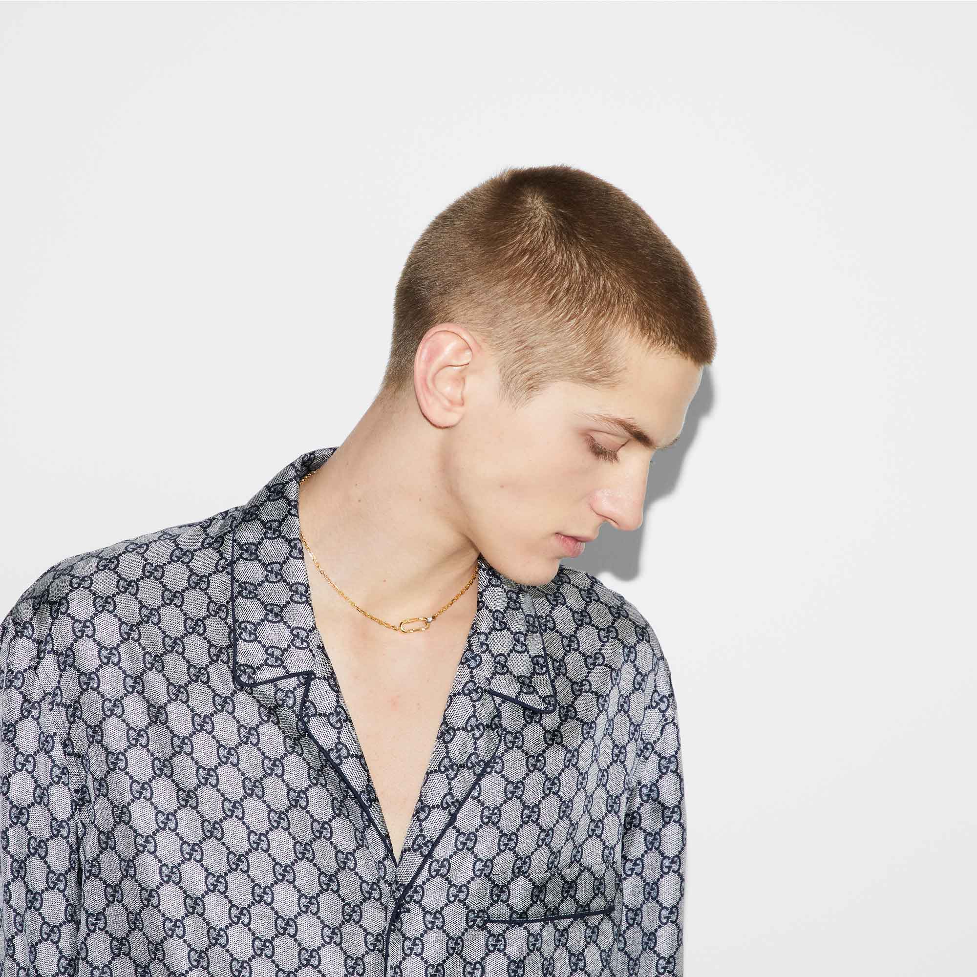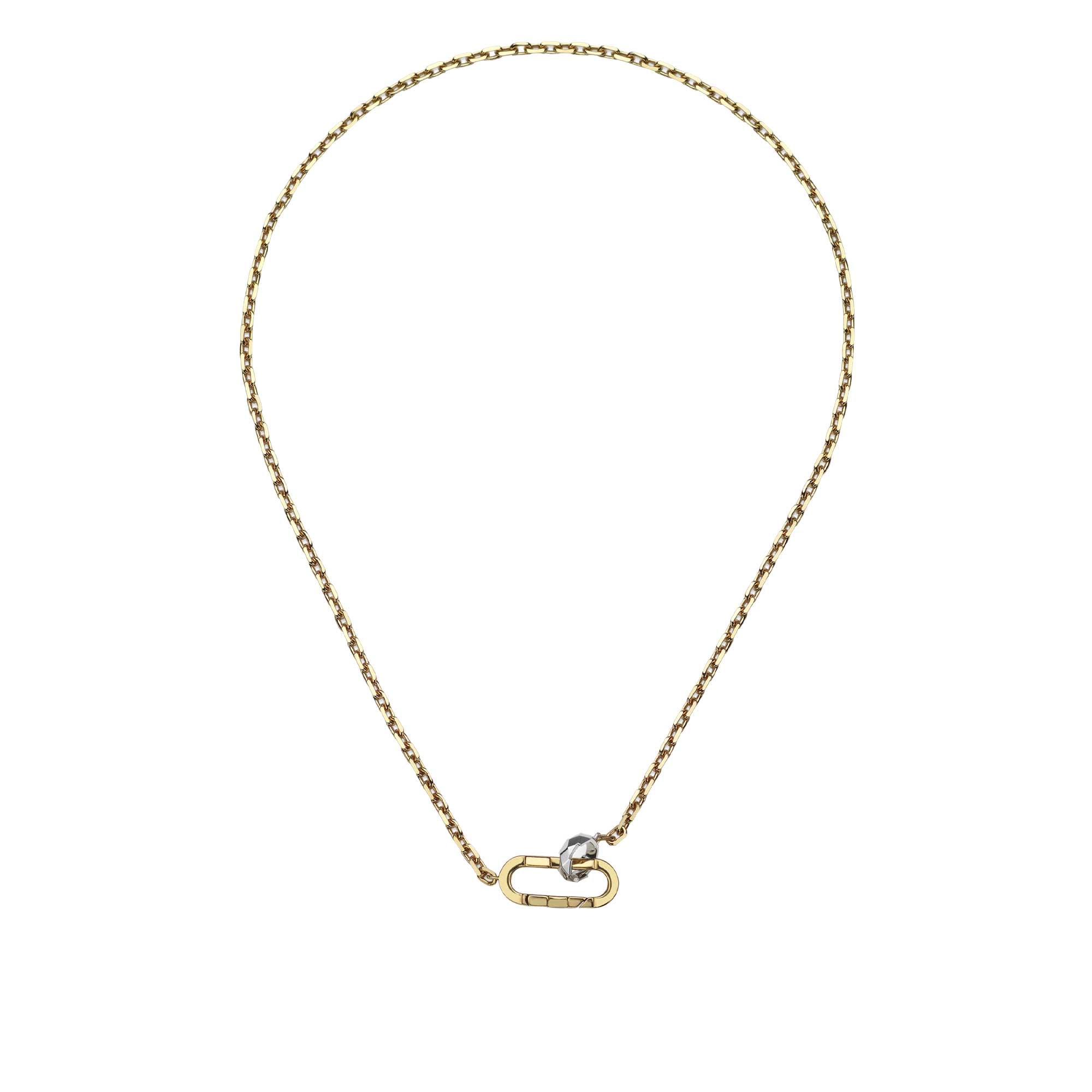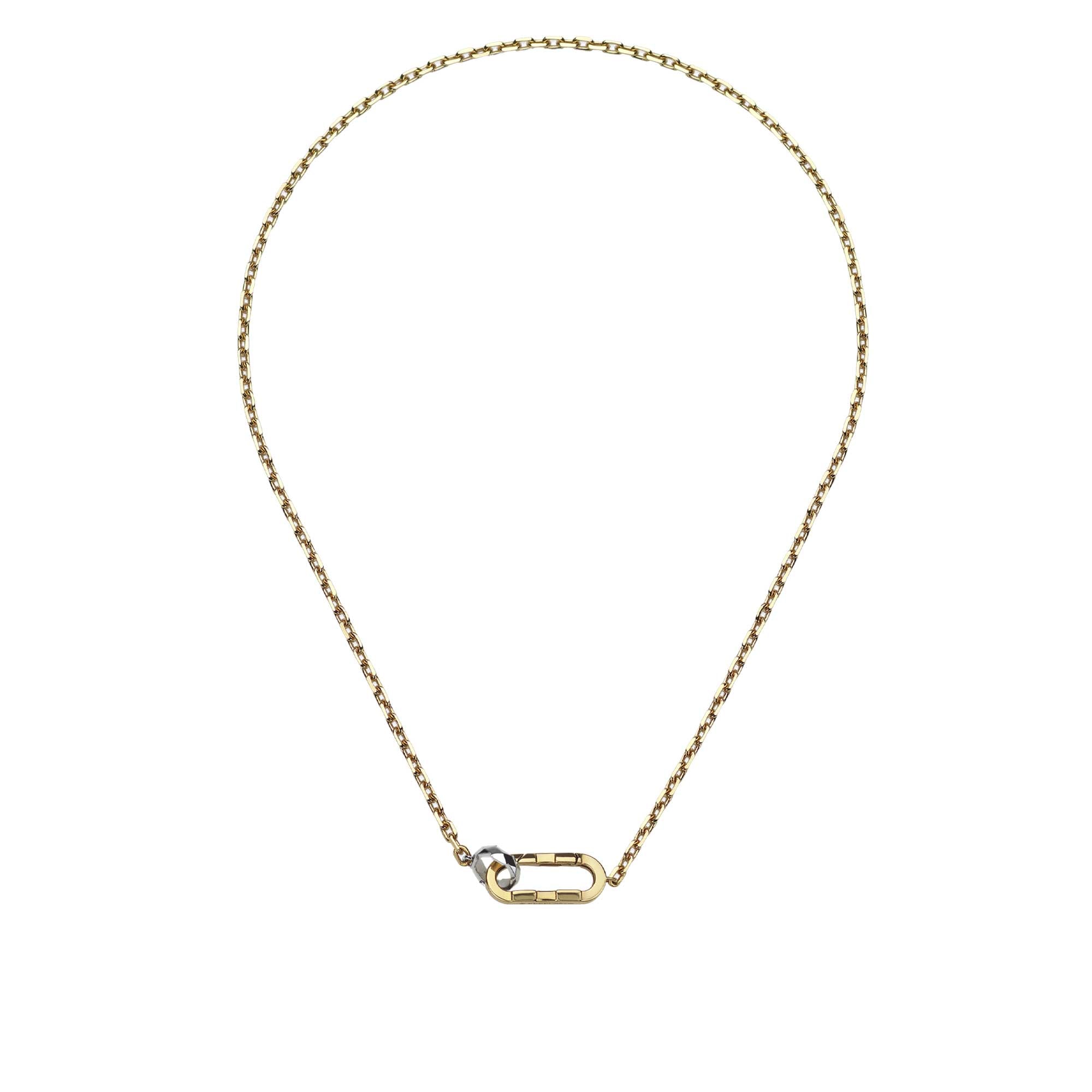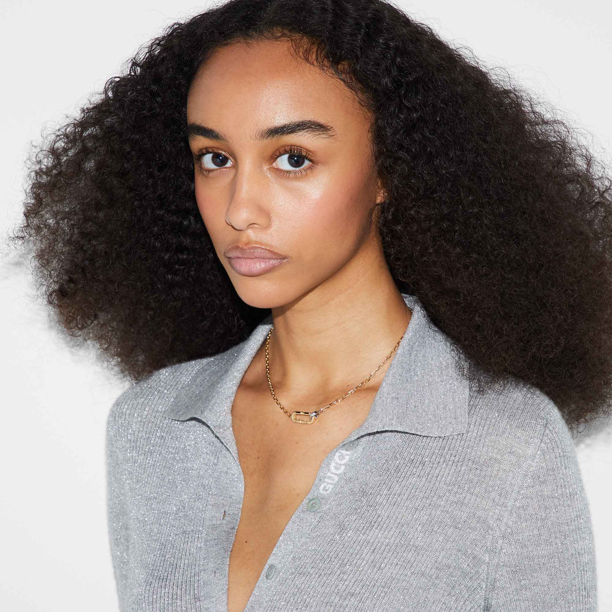 Una nuova chiusura costituita da una maglia rettangolare unita a incastro con un piccolo cerchio diventa parte essenziale della linea Gucci Link to Love. Presente come elemento centrale di collane, orecchini e bracciali, questo elemento dal design moderno rafforza il concetto di unione. Qui, il dettaglio definisce la chiusura di una collana a catena in prezioso oro giallo e bianco.